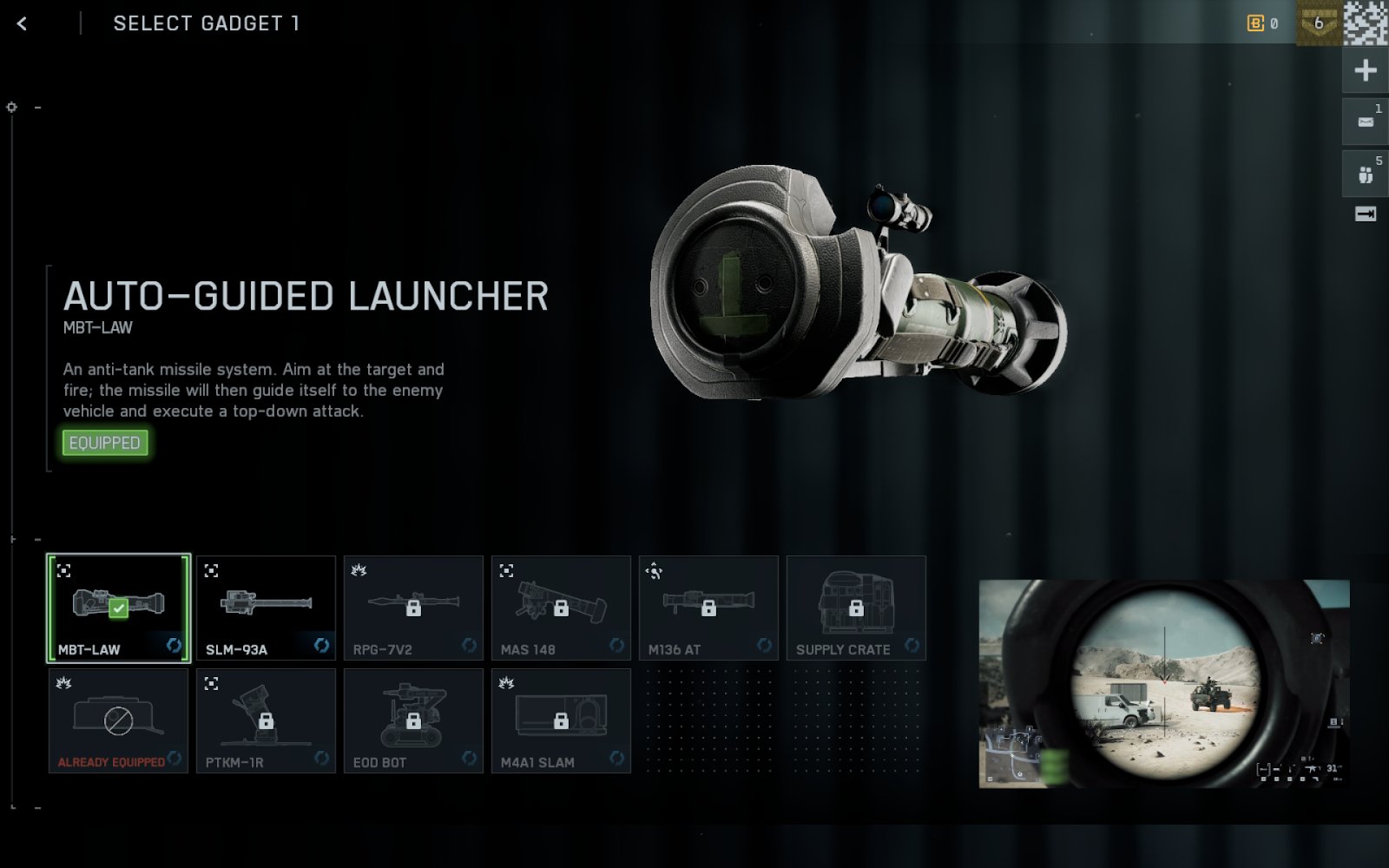 You can also take down targets that a far away if they are marked by the Laser Designator or Tracer Dart. Switch to this launcher as soon as you unlock it; it’s much better than MBT-LAW.