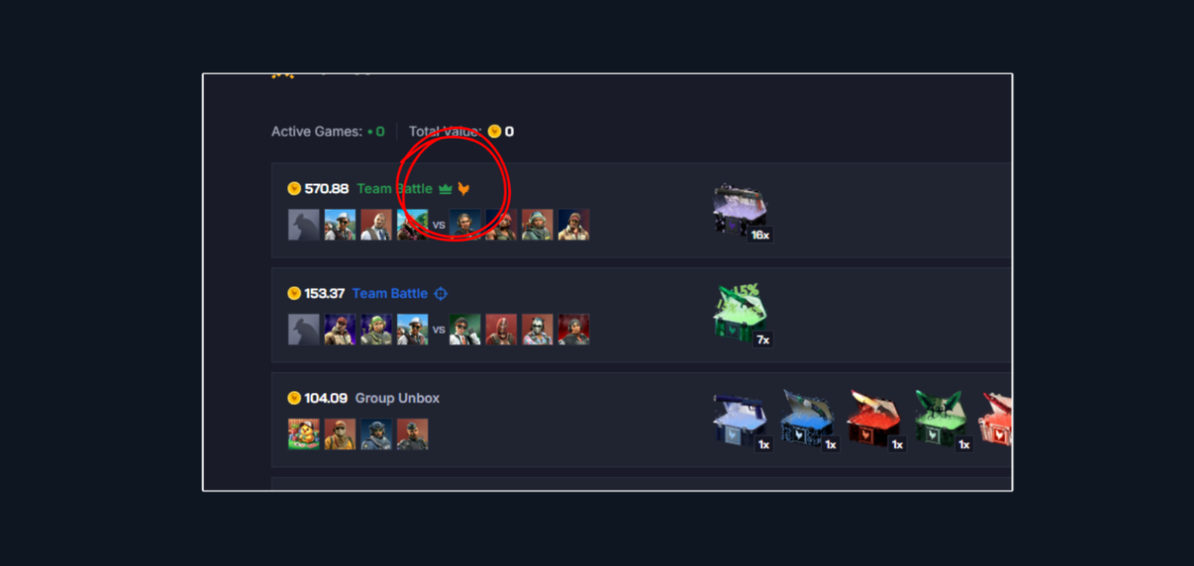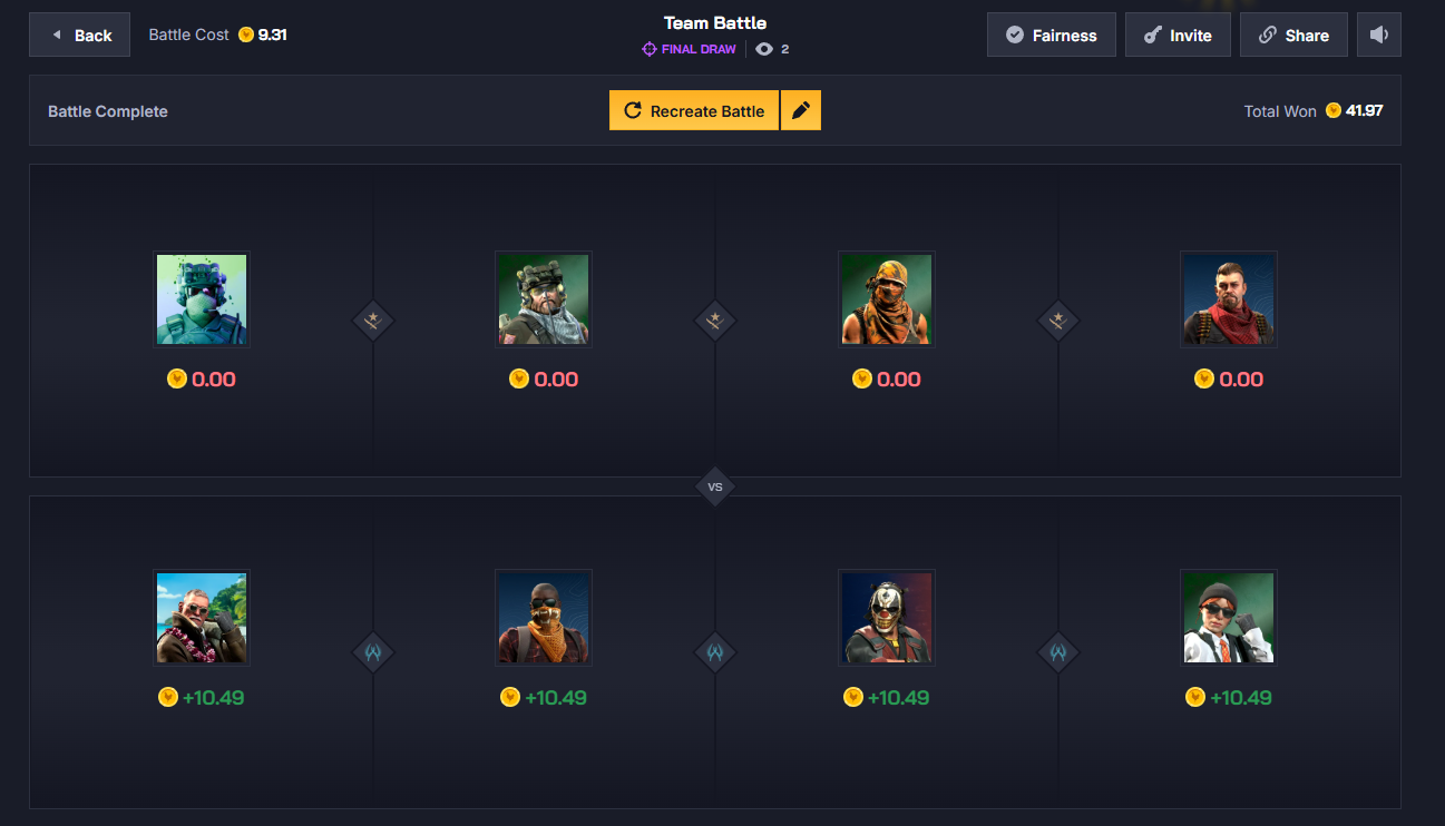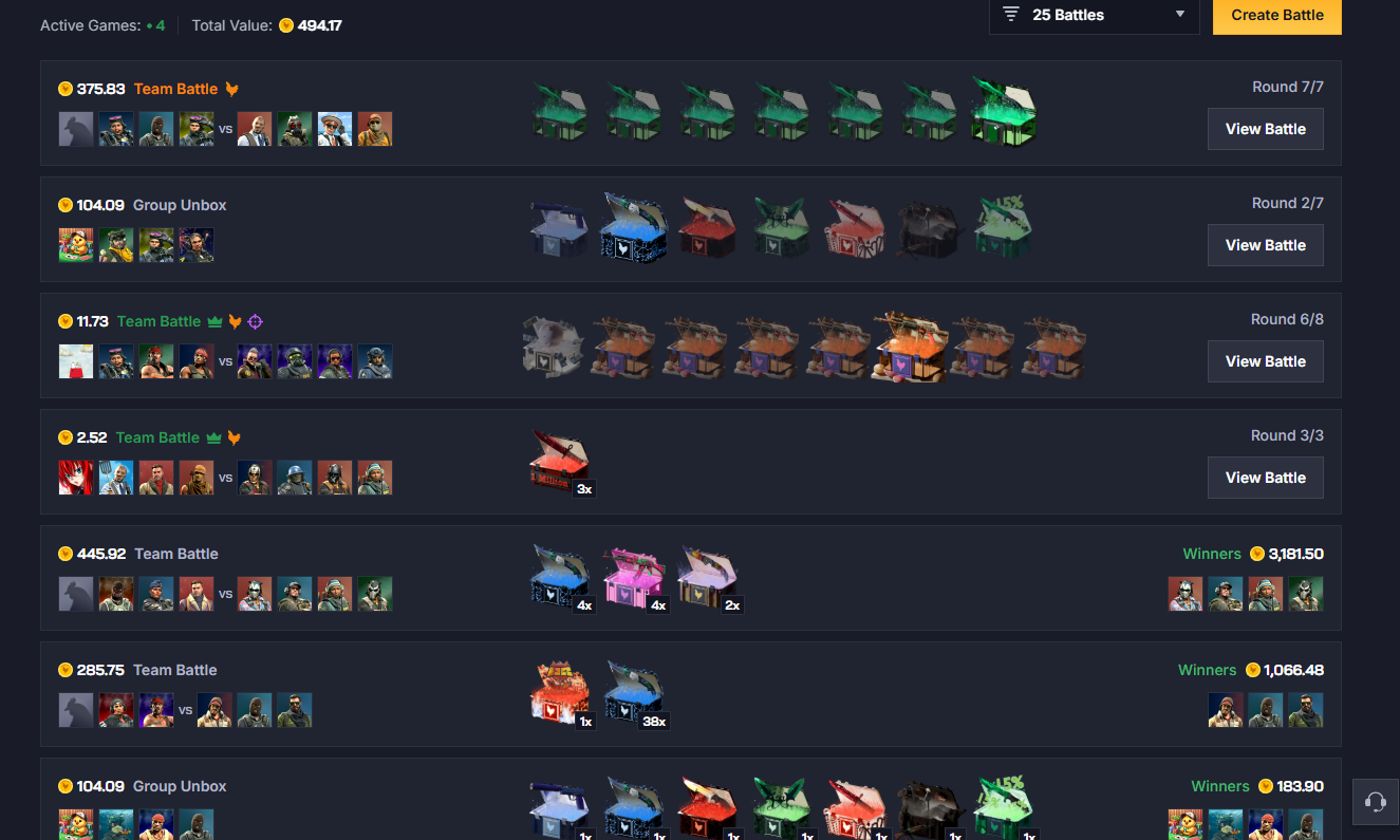In a Team Battle, players group up and try to win the game in teams. In a basic Team Battle, the team with the highest unboxed value wins the pot. You can play 2v2, 3v3, or 4v4.