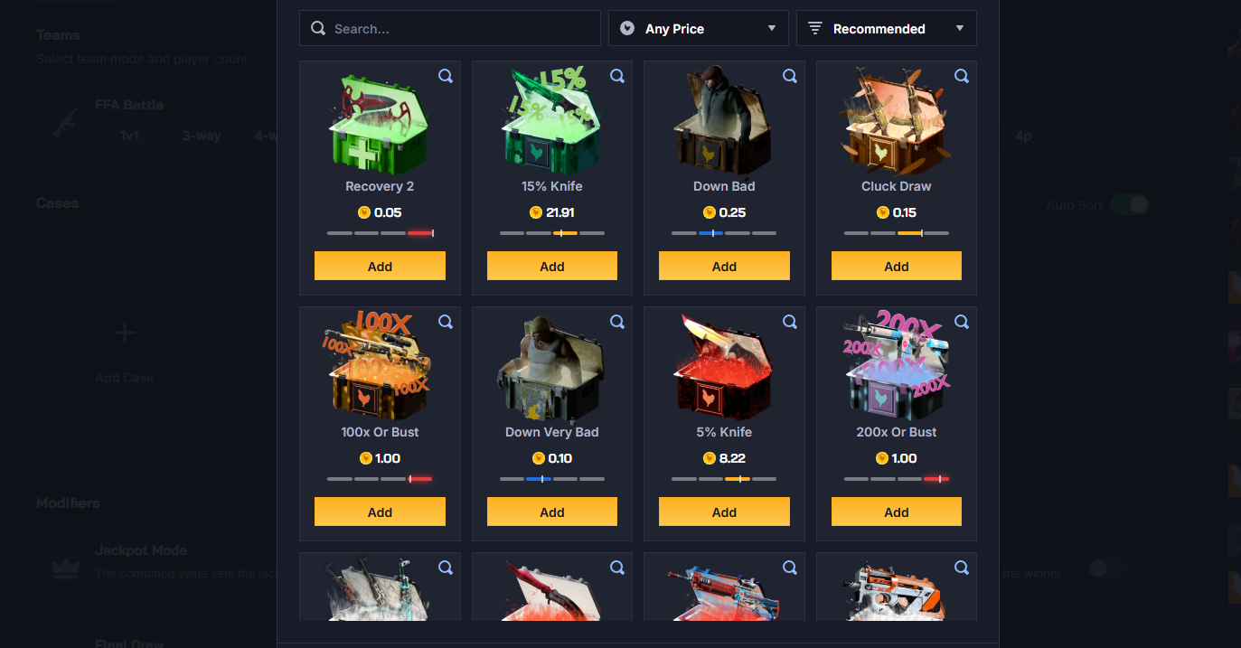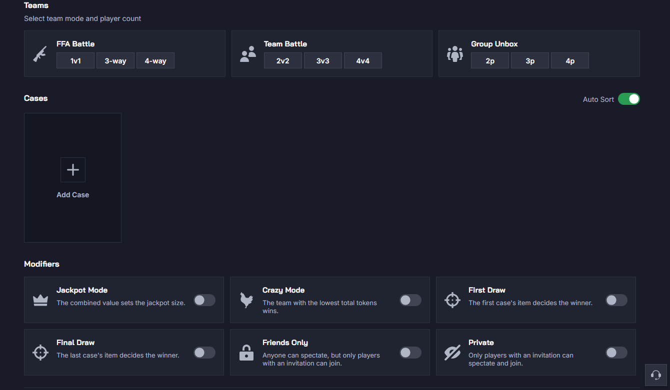 However, there are tons of extra (optional) rules that you can select when playing Case Battles on Chicken.gg. You can, for example, not battle, and just open cases together. The profits of all players then get split equally between every participant. Alternatively, you can spice things up and go for a team battle.