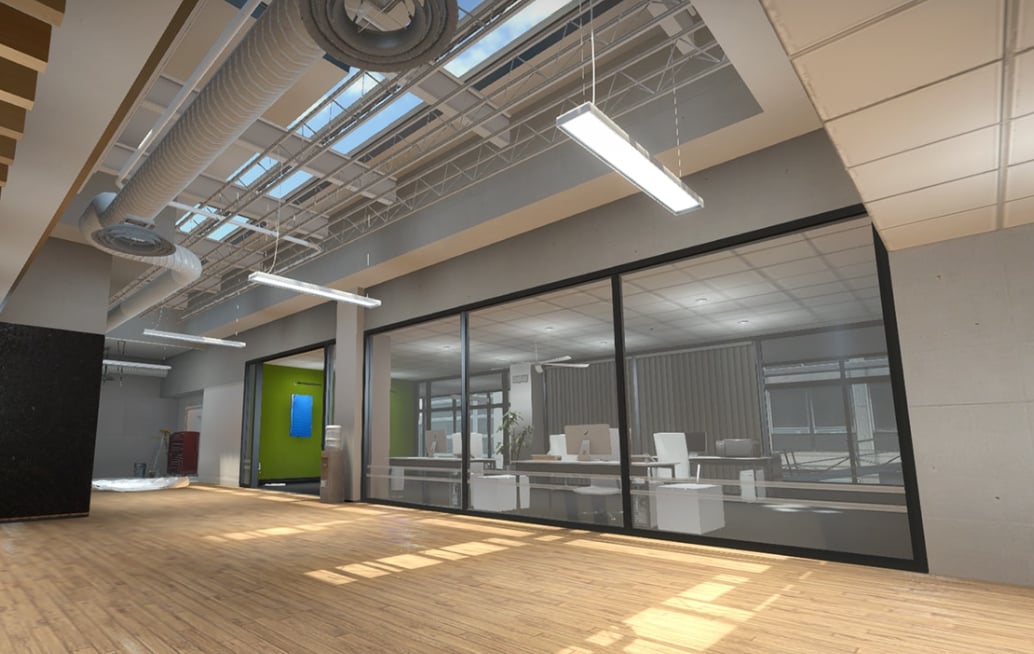 A corporate skyscraper on multiple levels. Outside, it has huge sightlines. Inside, things can get pretty close-quarters.