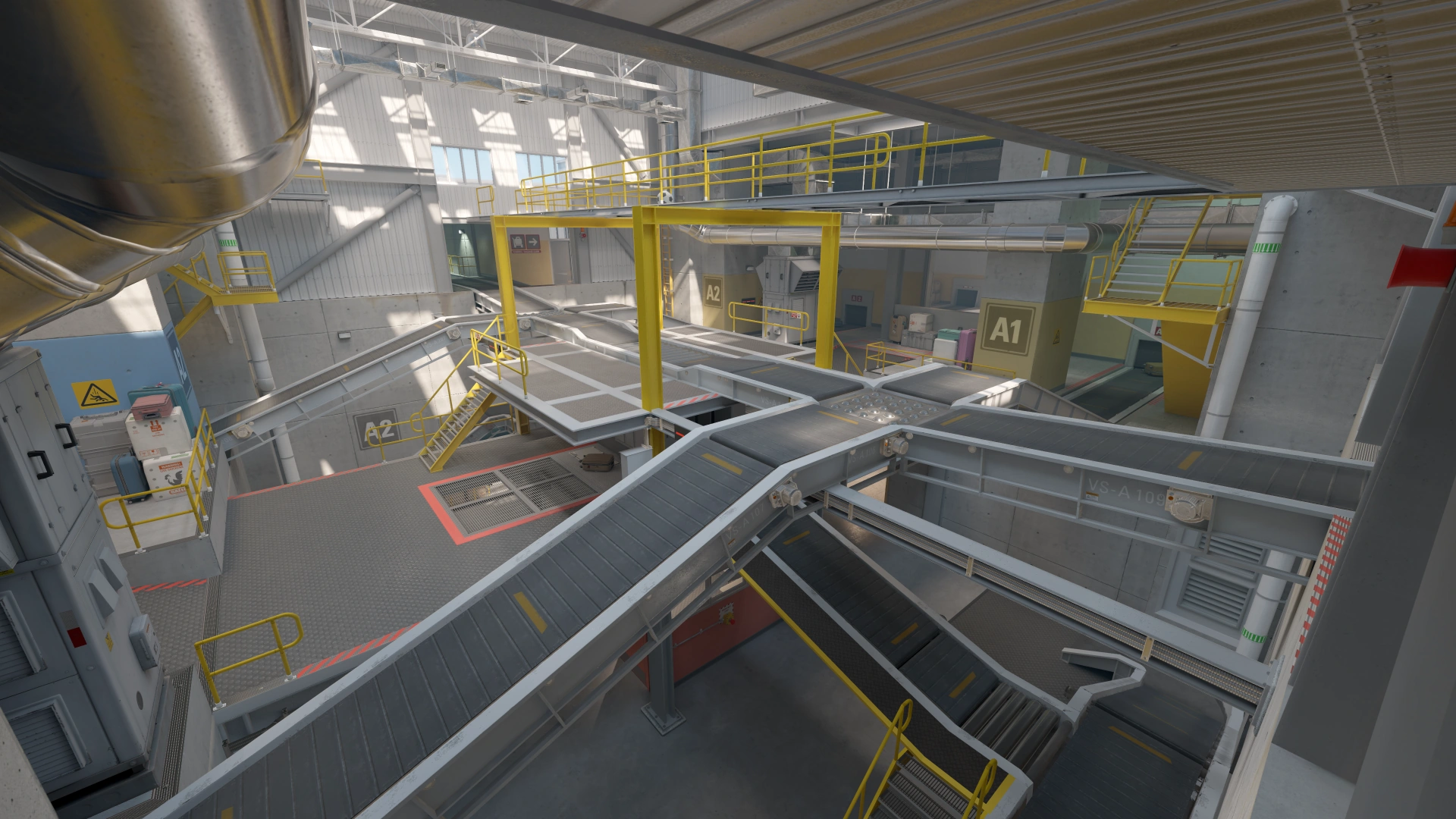 Set in an airport luggage area, this square map has lots of verticality. As a cool little easter egg, the conveyor belts can be turned on or off by players. You can do this in the control booth at the bottom of the map.