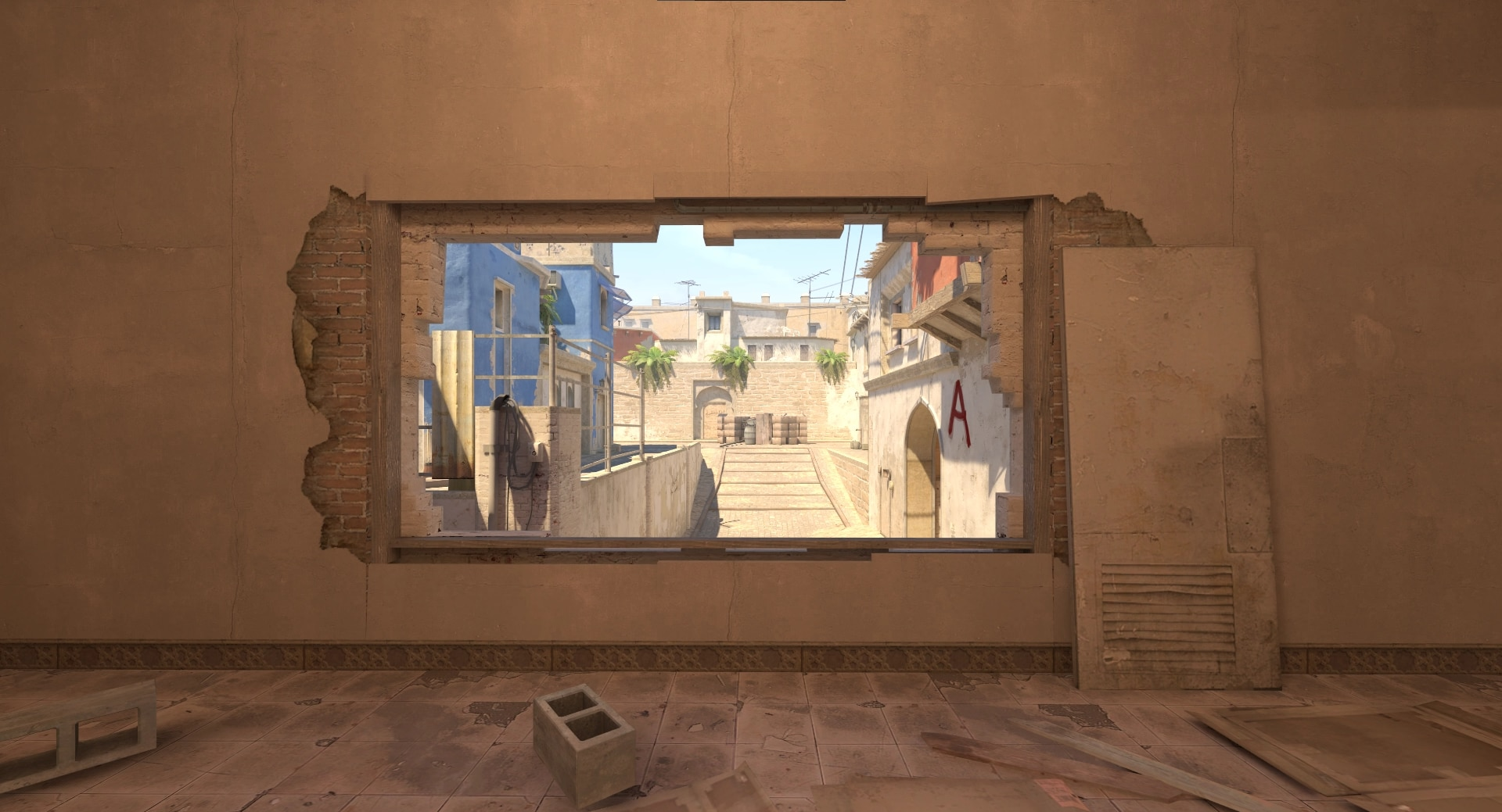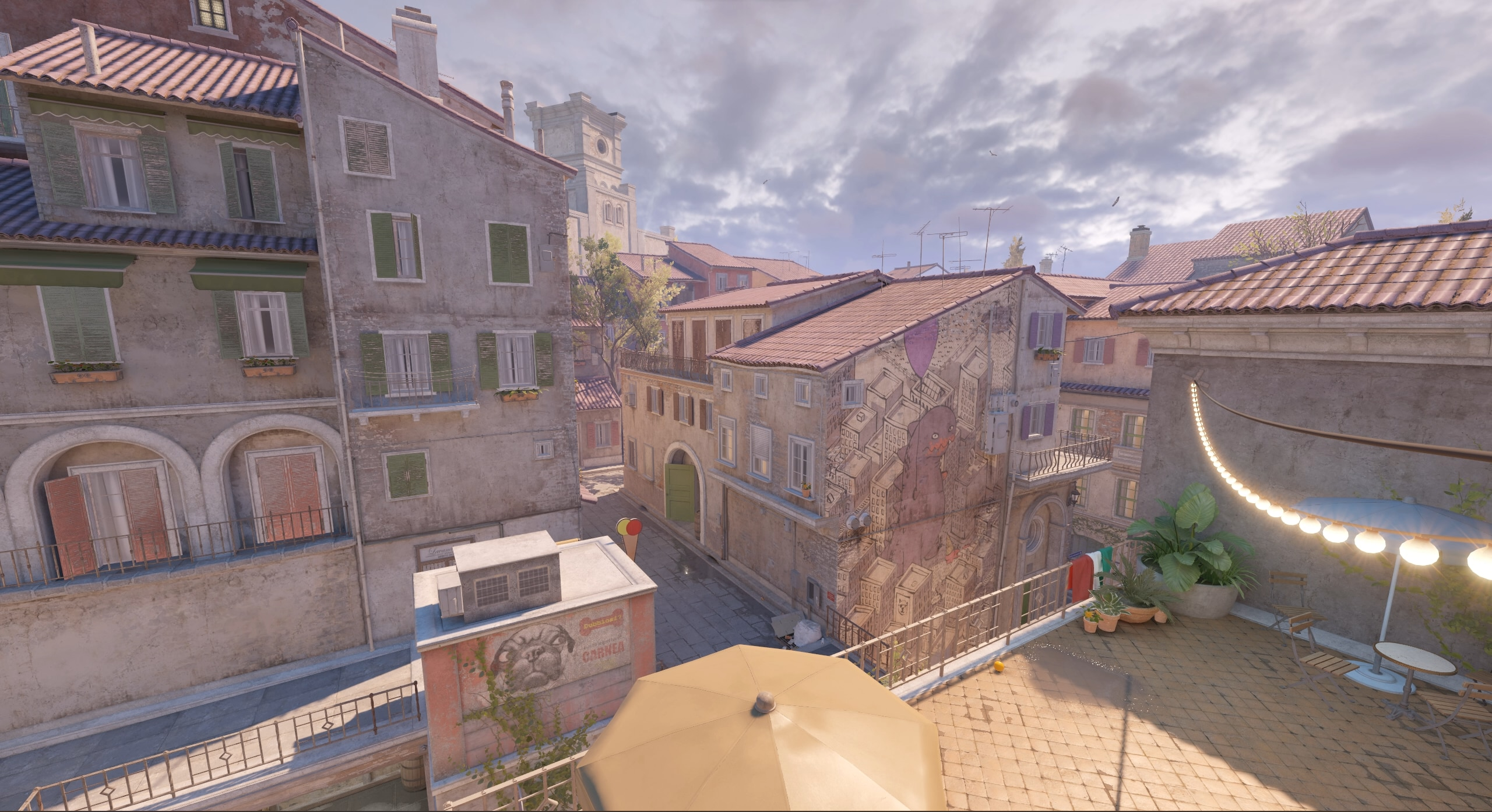 A sunlit Italian village with winding alleys. Terrorists can turtle hard here, so CTs need utility to flush out hostages.
