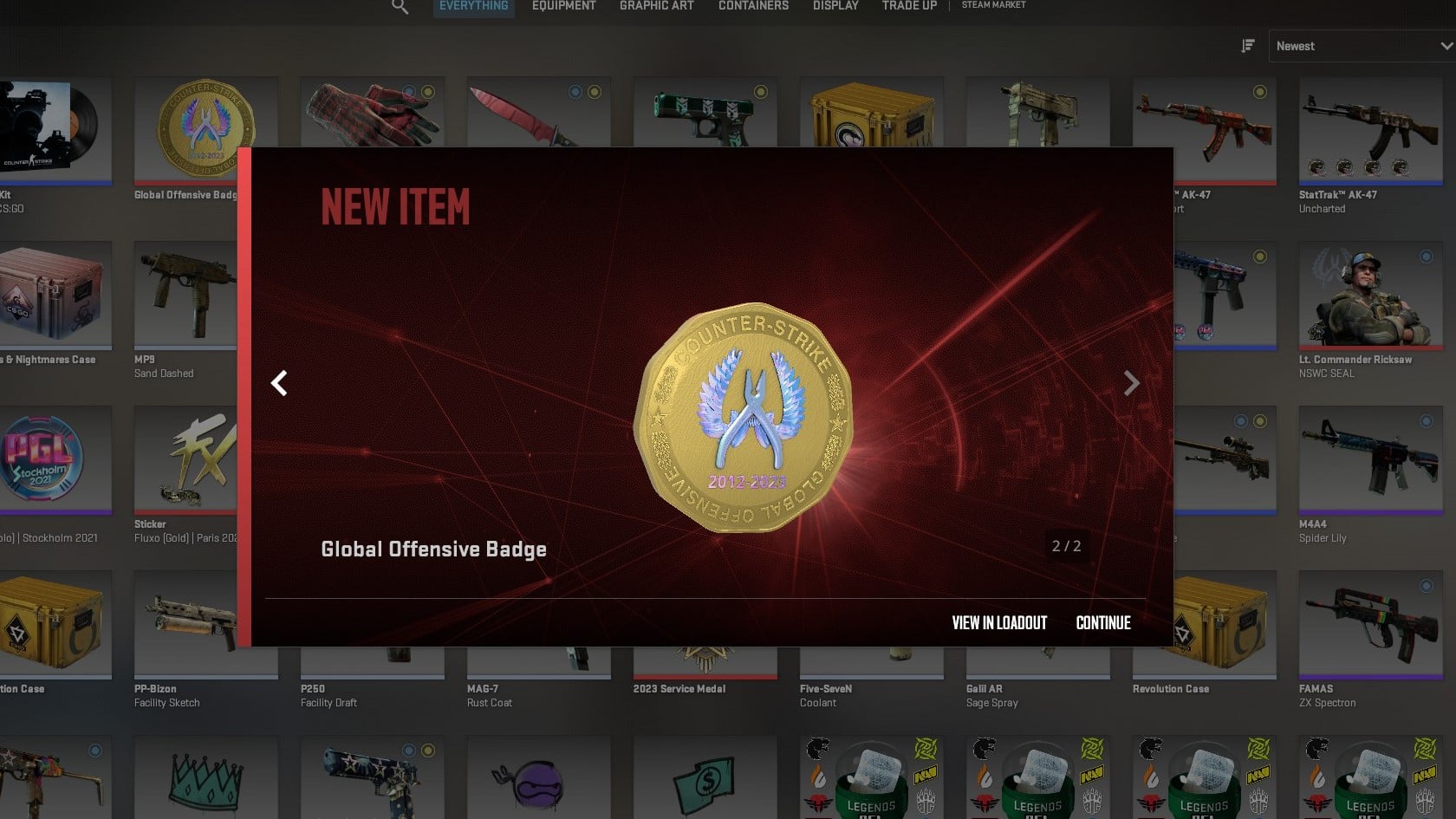 Players who have played CS:GO more than a week ago will receive a Global Offensive Badge and a Global Offensive Music kit. The coin can be displayed on your profile, and the music kit contains the original CS:GO music (CS2 has new music) and functions as any other music kit; it has an MVP sound, a main menu sound, and so on.