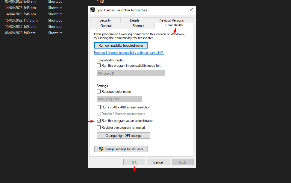 After verifying files, the next best step is to allow Epic Games to run as administrator. It grants the launcher any permissions it might need to run Fortnite efficiently. This is also quite easy to do: