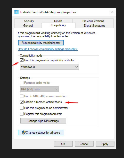The next fix you can do to avoid Fortnite crashes is to set the Compatibility mode to Windows 8.