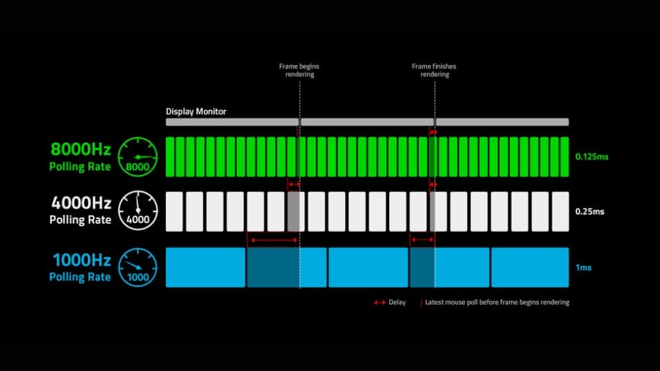 Very simply put, the polling rate of your mouse indicates how often your mouse is sending its position (and whether or not an input has been made) to the PC. If you’re playing at a polling rate of 100Hz, your mouse sends its information to the PC 100 times per second, if you’re playing at 8000Hz it sends its information (you guessed it) 8000 times per second.