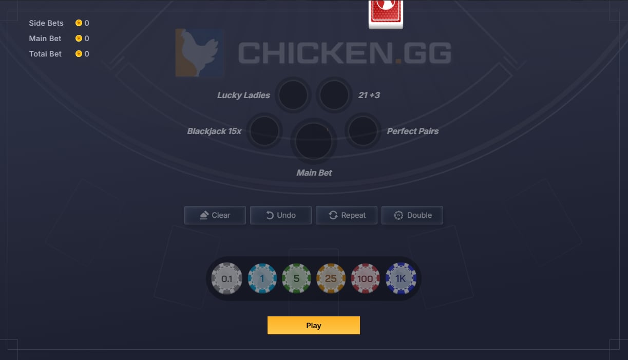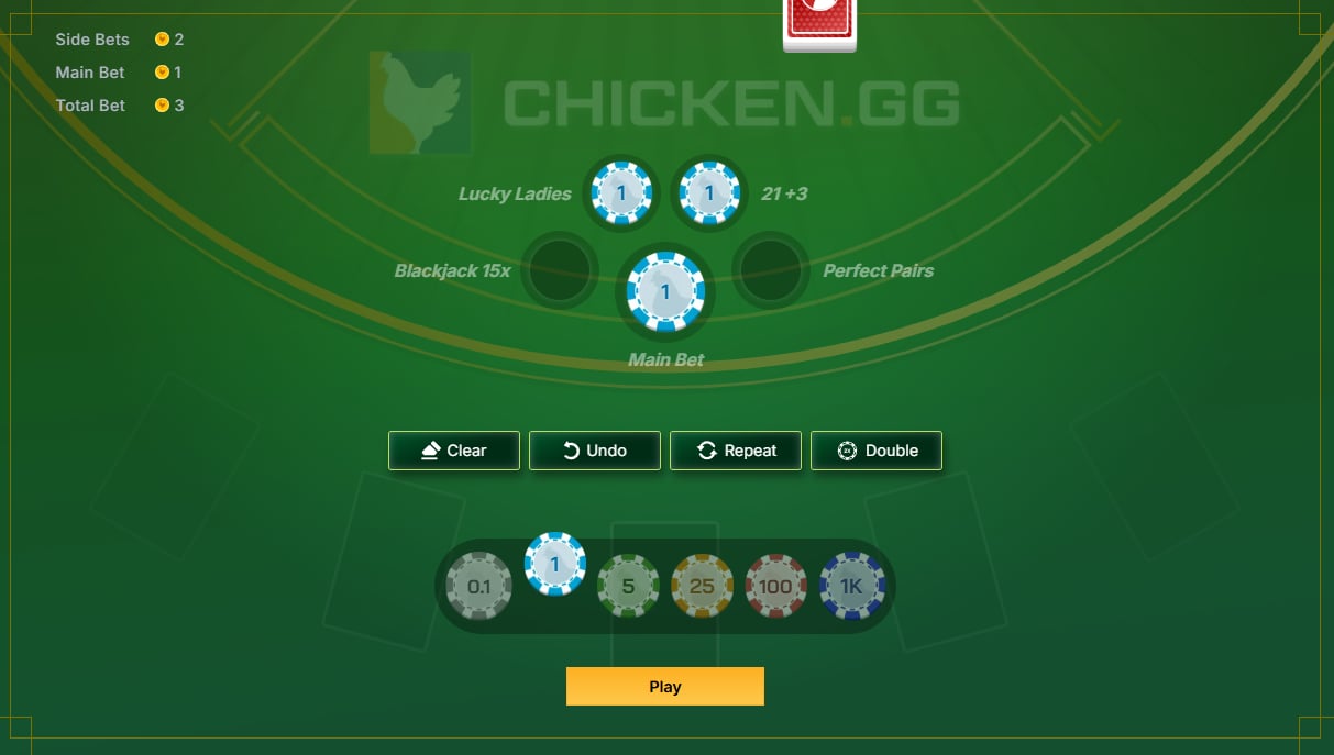 Understanding the Table Layout on Chicken.ggWhen you sit at Chicken.gg’s virtual Blackjack table, you will see several betting circles. There is the main bet, which is where you place the bet you’re wagering on the main Blackjack game. Then, there are also the side bets (Lucky Ladies, 21+3, Blackjack 15x, and Perfect Pairs). These are optional; you don’t ever need to place any chips here if you’re not interested in side bets.