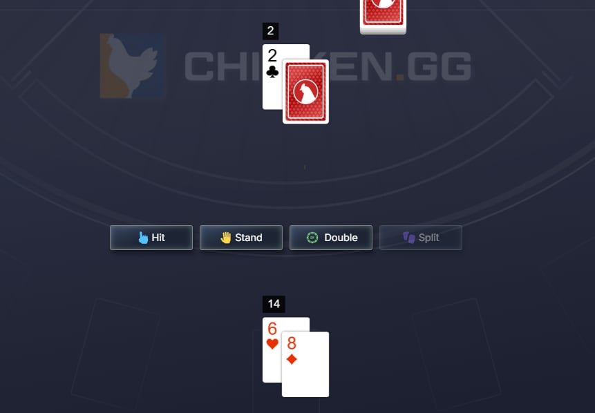 Hit : you get another card.Stand : you keep your current hand, and the dealer begins playing.Double : you double your main bet, after which you receive one more card. You cannot get any more cards after this. Players often double when they have a good opening hand against a subpar up card from the dealer.Split : if you have two cards of the same rank, you can split them into two separate hands. You then play on with those hands independently. You cannot click actions that aren’t allowed (e.g. splitting with two different rank cards) so you don’t need to worry about that on Chicken.gg.