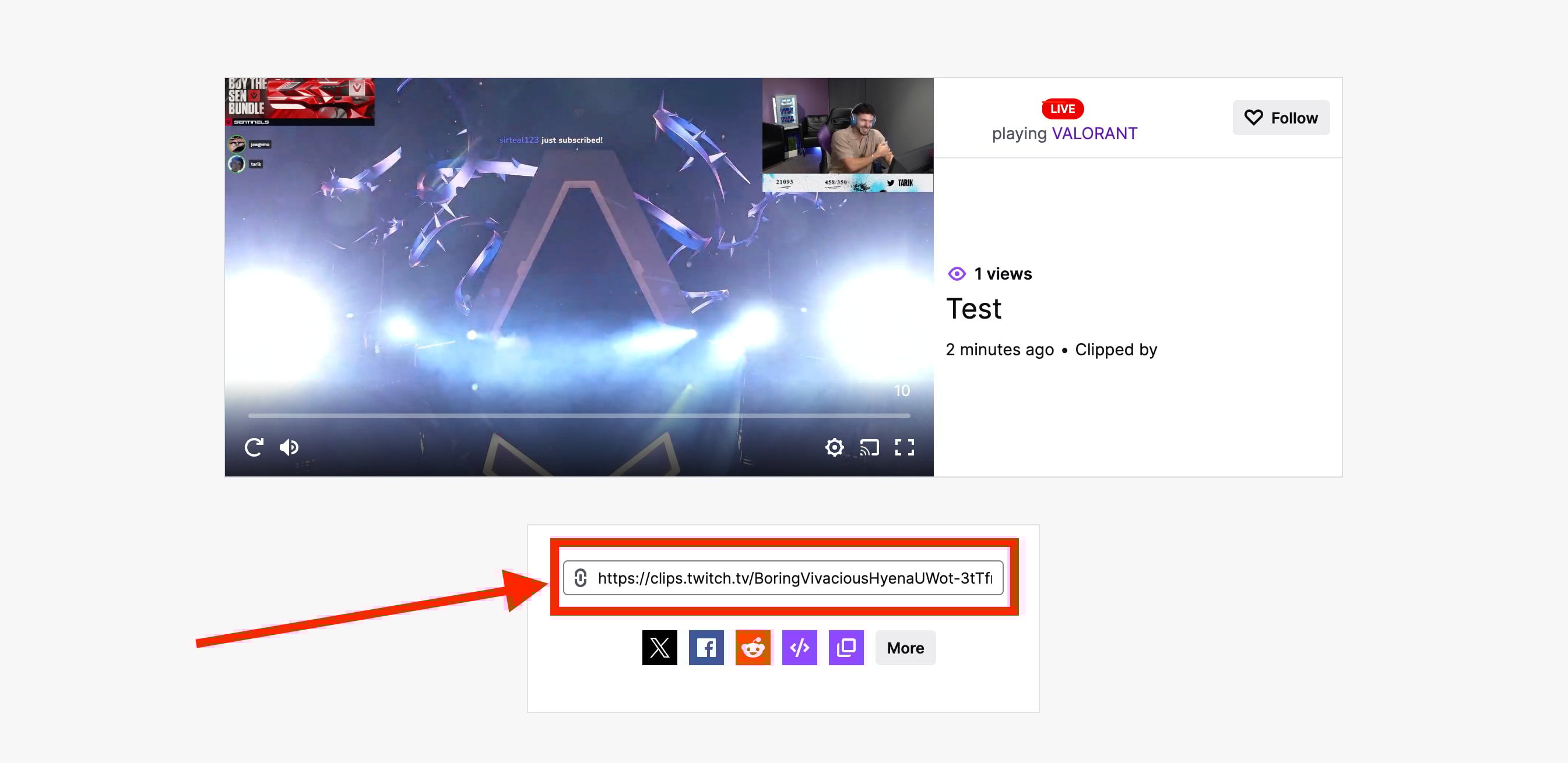 - You’ll see a new window pop up. There, select the section of the stream you’d like to clip, title the clip, and then click ‘Share clip’.