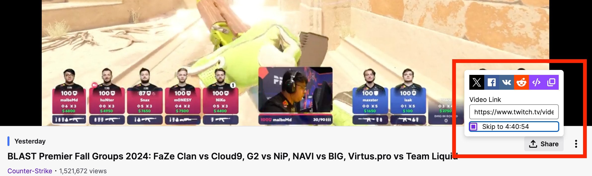 If a Twitch stream has ended, you can easily share a VOD that starts at the relevant timestamp. You do not need an account to do this, but do note that it only works on VODs of past livestreams, not on streams that are still live.
