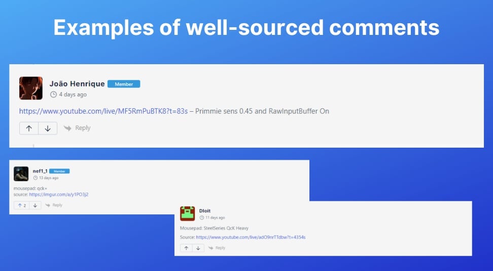 A comment that simply says ‘this is outdated’ or ‘this needs changing’ is not very helpful. If you notice that certain elements of a player page are outdated, please specify which ones. It’s preferable to link to valid proof (see further down in the article) but if you just saw a flash of, for example, a different mouse in a livestream, you can obviously post that.
