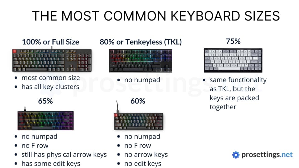 This is the second most common keyboard size out there. If you have no use for a numpad then this is without a doubt a great size to consider. Thanks to its more compact form factor you’ll have more room for your mouse area, and the reduced size means that it’s a bit more portable than a full size board.