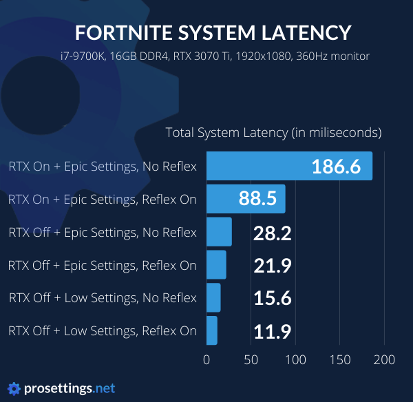 Looking at the results, it’s quite obvious that you’re going to want to lower your settings if you’re a competitive-minded Fortnite gamer. With Reflex enabled, there’s a difference of around 16 milliseconds between playing at epic settings and playing with your settings lowered.