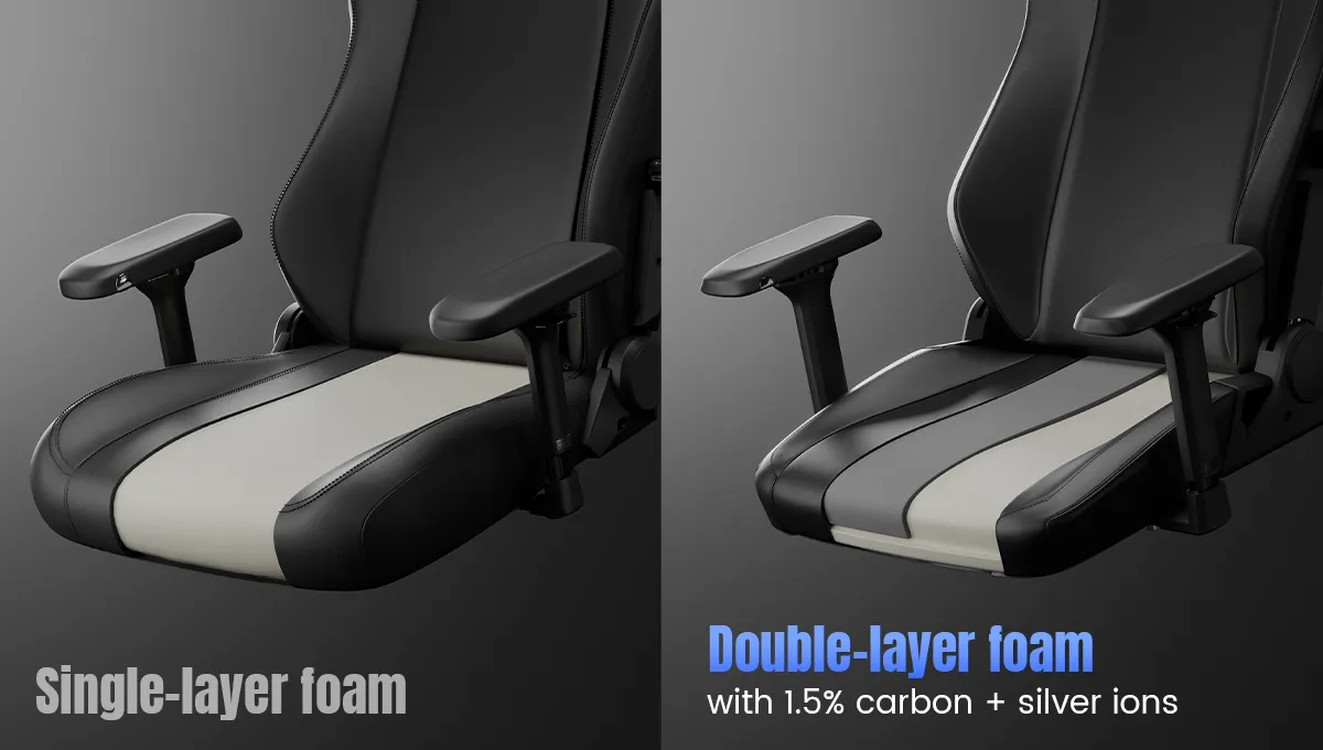 | Cushion | Dual layer: memory foam top layer with carbon powder and silver ions + a PU base layer | Molded polyurethane foam | More supportive |