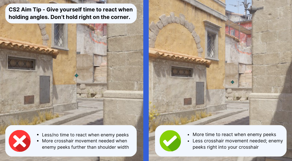 When pros hold corners, they almost never place their crosshair a pixel or two next to the corner that they’re holding. They usually keep some distance between the corner and the crosshair, and you should do this too. Putting your crosshair away from the angle a bit will give you more time to react, and peeking enemies will peek right into your crosshair rather than past your crosshair, resulting in less crosshair adjusting from your part.