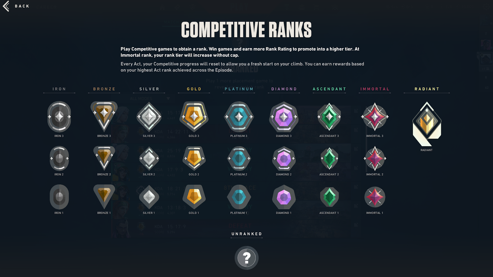 The VALORANT ranking system consists of nine main ranks, each divided into three tiers (ranging from 1, the lowest, to 3, the highest):