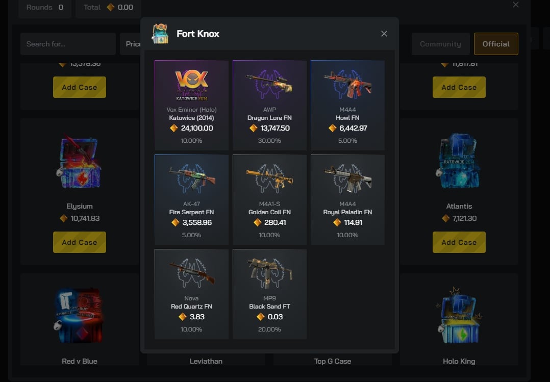Clash.gg also has user-created cases, for example. This can lead to some very interesting cases. You get cases that cost tens of thousands of dollars in website balance to open, and you also have cases that cost $0.05 to open. With so many options to choose from, you’re bound to find a case that matches your preferences when it comes to the odds/price ratio.