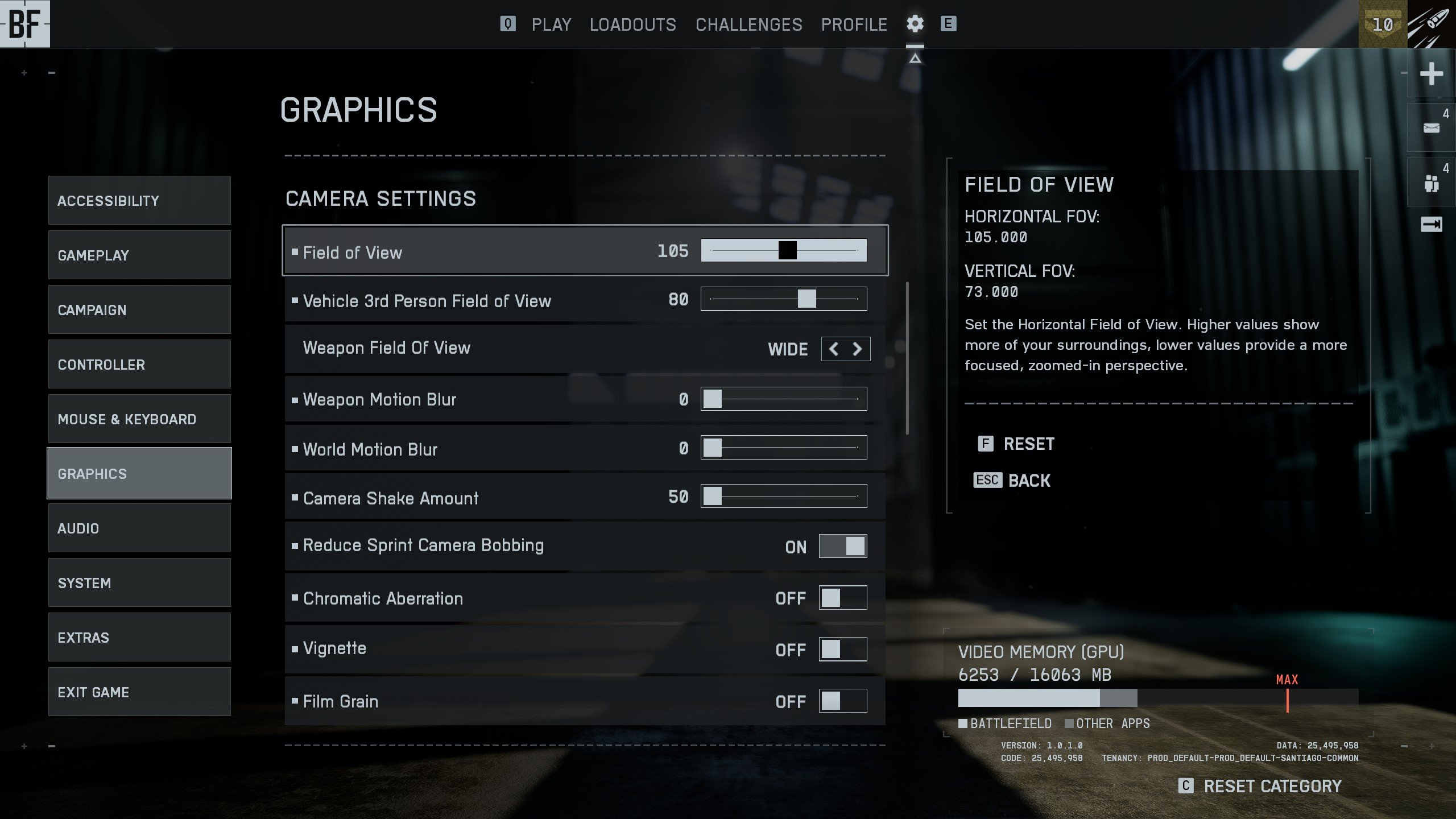 | Vehicle 3rd Person Field of View | ~80 | This is personal preference. We leave it around default. |