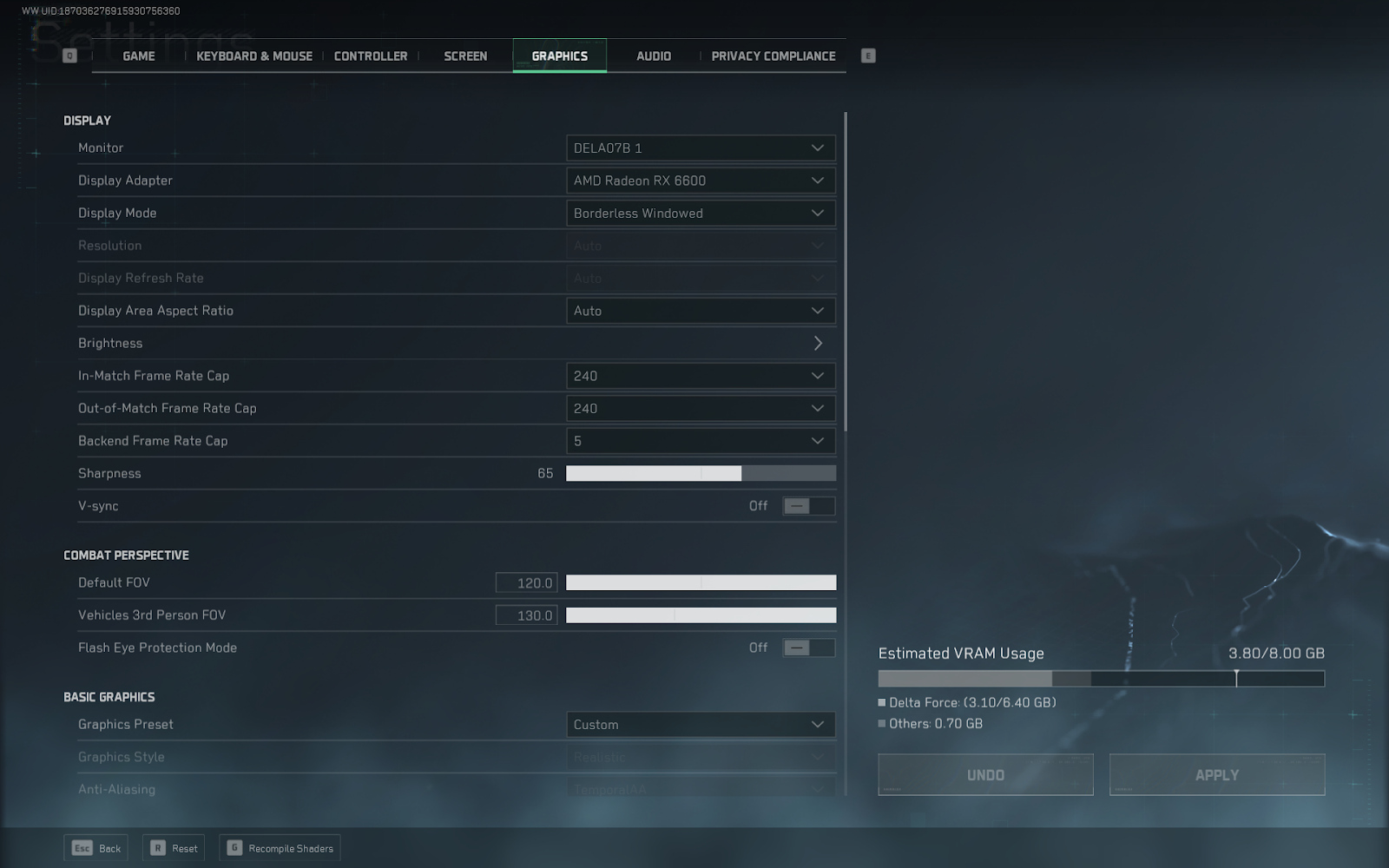 | Out of Match Frame Cap | Set to monitor’s Refresh rate (144, 165, 240, etc.) | In Delta Force, the playable menu in Extraction mode and the Range count as ‘out of match’. If you have it at 60, both of them will run very choppy, so set this to your monitor’s refresh rate. |