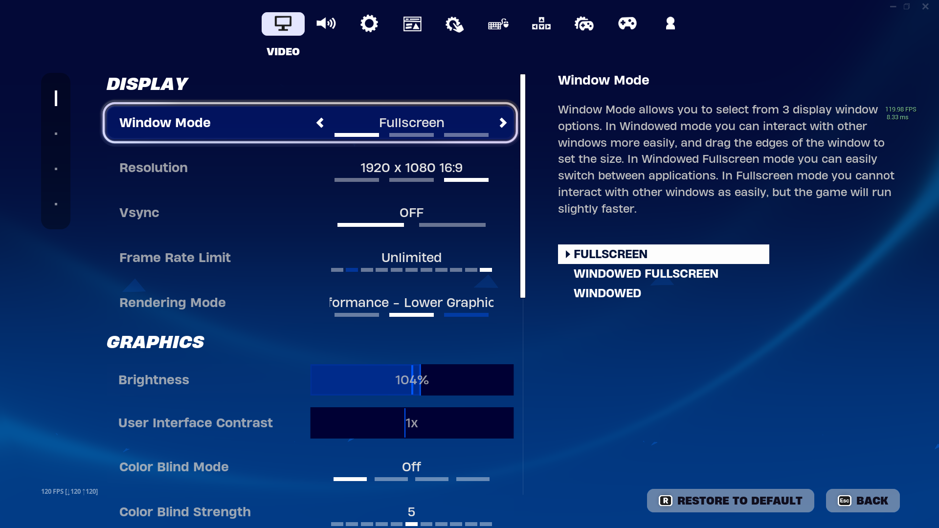| Window Mode | Fullscreen | Using anything else can cause input lag. |