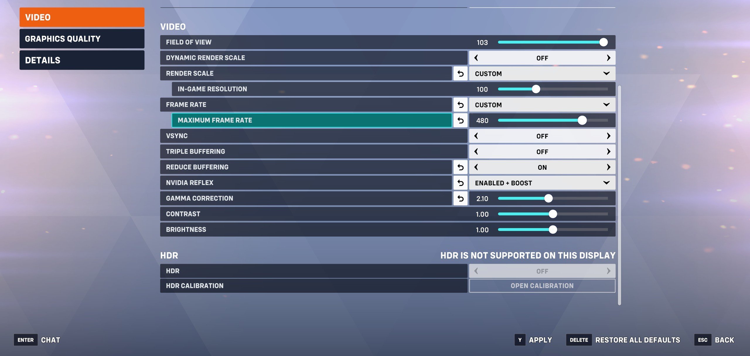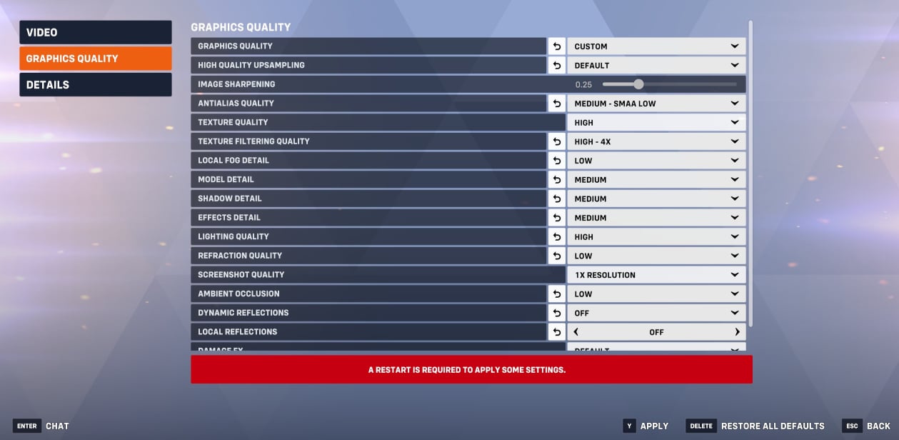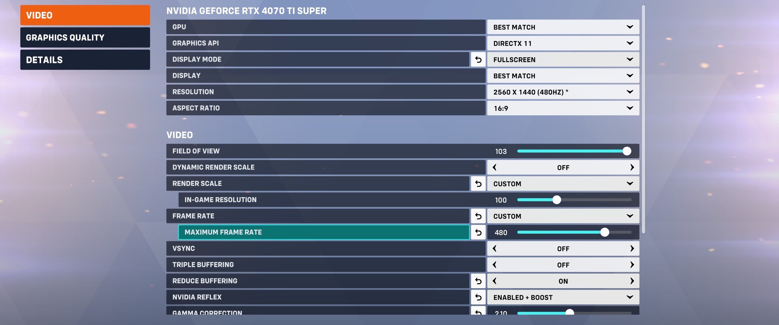 Setting Name Setting Value Explanation Graphics API DirectX 11 DirectX 12 is still in beta, and DirectX 11 works perfectly fine for us. Display Mode Fullscreen or Borderless Fullscreen Both modes work fine and don’t introduce any input lag. Display Best Match Or manually choose your main gaming monitor. Resolution Your monitor’s native resolution Don’t forget to choose the correct refresh rate Aspect Ratio Your monitor’s aspect ratio N/A Field of View 103 This is the max setting, which isn’t too wide. If you really want a more focused perspective, turn this down, but we don’t recommend that. Dynamic Render Scale Off This lets the game render at different resolutions depending on the game’s load. This can cause confusion and makes the game look erratic. Render Scale Custom (100) Set this to 100. Anything lower can make the game look awfully pixelated really quickly. Frame Rate Custom (preference) We set this to our monitor’s refresh rate, but you can easily set it higher than that, too. If you have a lot of frame rate variability and it causes tearing or other issues, it’s best to cap this value. V-Sync Off Meant to combat screen tearing, but this causes input lag. Leave it off. Triple Buffering Off Adds input lag. Reduce Buffering On Reduces input lag. NVIDIA Reflex On + Boost Reduces your system lag. If On + Boost gives you issues, you can use lower settings though. Gamma Correction 2.10 (or preference) We find the default of 2.20 to look too bright. For us, 2.10 looks better, but this depends on your display and preference. Contrast 1.00 No need to change this. Brightness 1.00 We prefer adjusting the brightness on our monitor, so we leave this at default. High Quality Upsampling Off This renders your game at a lower resolution and then upscales it via AI. It can be useful in some games, but Overwatch runs so well we don’t find it necessary. If you have a low-spec PC, you can experiment with this, however. Antialias Quality Medium – SMAA Low This makes edges still look decent without a huge performance hit. Texture Quality High This doesn’t have a major effect on frames per second in our testing, so we leave it at high. Texture Filtering Quality High – 4X This is a good middle ground between performance and visuals. Local Fog Detail Low Fog and pretty smoke effects don’t have a gameplay influence. Performance impact is rather limited, but we set this to low since it’s eye candy. Model Detail Medium Balance between visual fidelity and performance. Shadow Detail Medium Shadows aren’t really needed in Overwatch 2, but the performance hit is minimal so we set this at medium. Effect Detail Medium A happy medium between performance and visuals. Lighting Quality High This provides a visual boost in darker areas in some maps, so we leave it at high. Refraction Quality Low This has an effect on how light travels through semi-transparent objects such as shields. It’s not needed for gameplay reasons and it can be quite the performance hog, so we leave it at low. Screenshot Quality 1x No effect on performance. Ambient Occlusion Low This is an eye candy setting that influences how light falls on certain objects. We set it to low because it’s not needed for gameplay reasons. Dynamic Reflections Off This is an eye-candy setting that can have a pretty big performance impact on some systems. We went for off, but you can also set this to low. Local Reflections Off Doesn’t serve a gameplay purpose, so we left it off. Damage FX Default This looks best to us, so we left it at default.