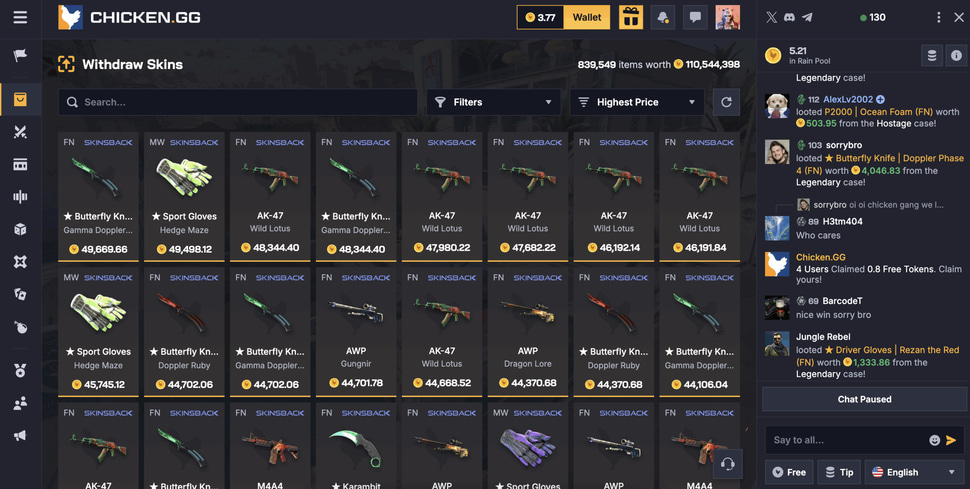 If you just want to open cases, Chicken.gg also offers that option. There are tons of cases to choose from, ranging from a couple of cents all the way to thousands of tokens (i.e. thousands of dollars).