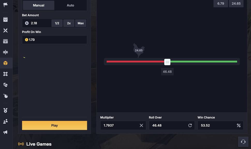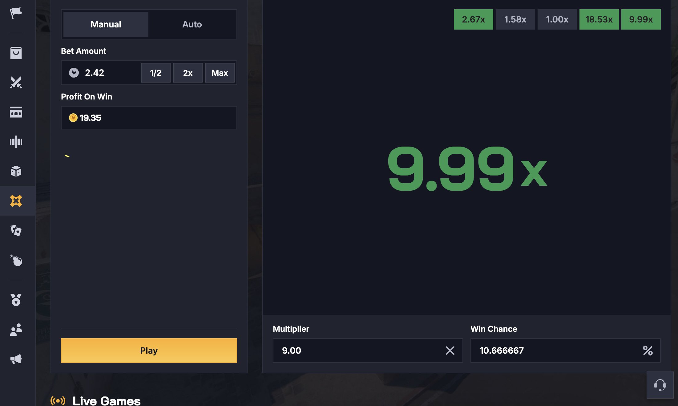 Limbo is another very simple game. You select the amount you want to bet, and then you choose a multiplier. Then, once the game gets started, the multiplier starts counting up, only to stop at a random point. If the multiplier that it stops on is higher than the multiplier you’ve bet on, you win. The higher the multiplier you choose, the higher your profit will be (if you win), since high multipliers have lower odds of happening. If the multiplier that it stops on is below what you’ve bet on, you lose your money.
