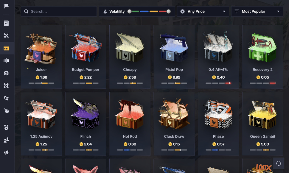What we like is that the volatility of a case is clearly indicated. The more volatile a case is, the smaller your chance of winning big. However, if you win the main prize in a volatile case, you get a much more valuable prize. So, in a nutshell, volatility indicates the risk vs. reward proposition.