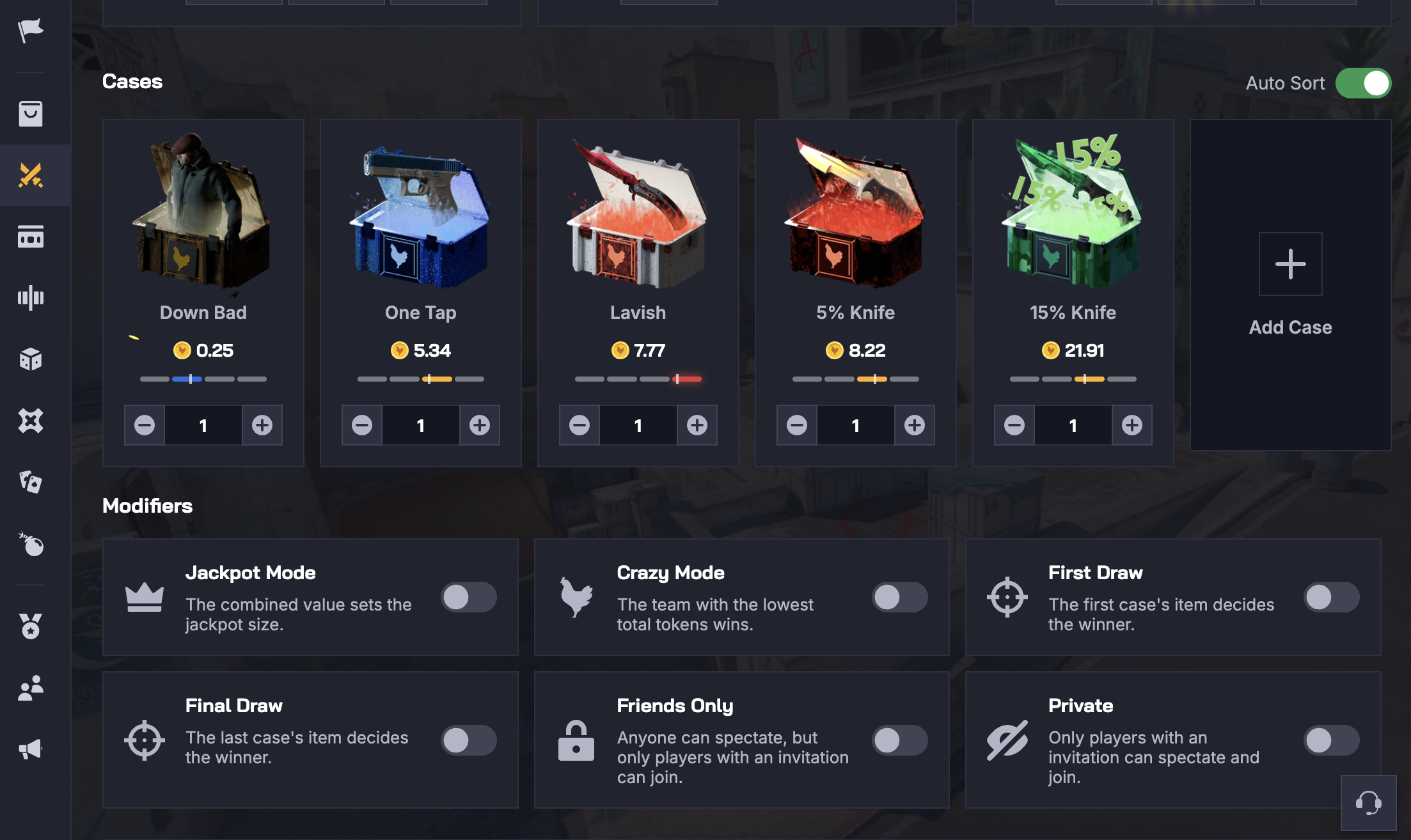 Like on other websites, there are also a bunch of options you can select to make the case battles even more exciting. For example, there’s Crazy Mode, where the player (or team) with the lowest unboxing value wins. You can also choose to make a private lobby in case you only want to play with friends.