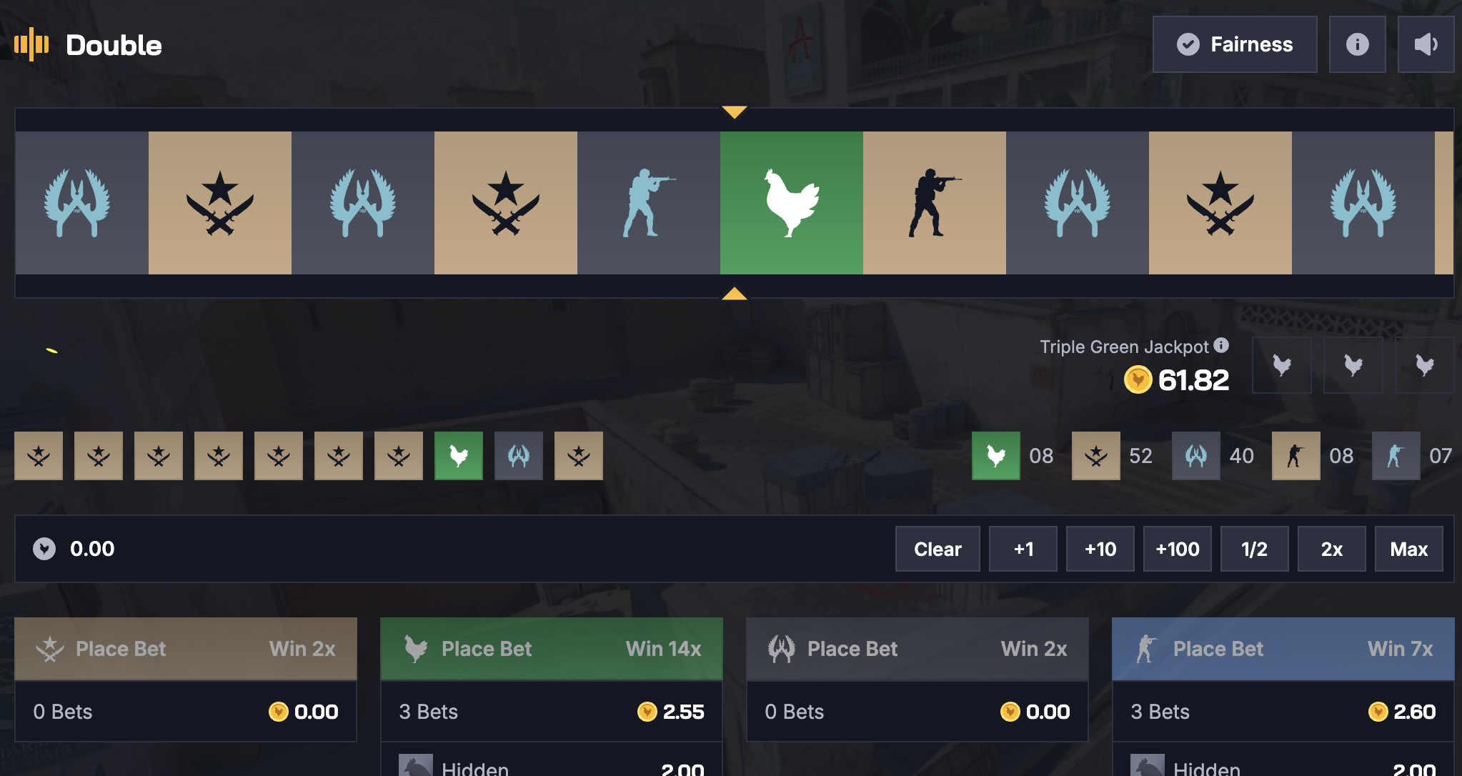 Double is Chicken.gg’s name for their roulette wheel. The premise here is simple: players bet a certain amount of tokens, and then a wheel gets spun. This wheel has CT (blue), beige (T), and chicken (green) icons. The CT and T icons are the most common, so if you bet on those and the wheel lands there, it pays out 2x. Chicken is worth 14x.