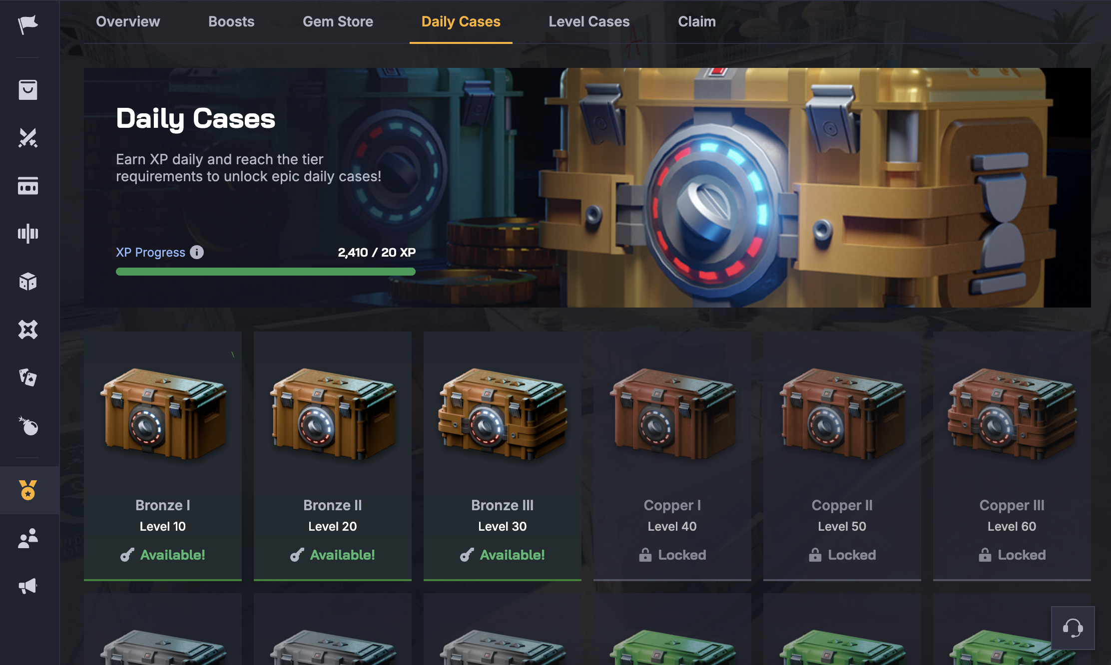 Levels give access to features like free cases (which start unlocking at level 10) and, at the higher levels, the boost feature. We should note that it takes quite a bit of wagering to get to the higher levels. We wagered a total of 2,150 tokens across various games and found ourselves at level 36, which isn’t all that high. We probably didn’t really optimize our leveling, but it’s still good to note. Features like the boost only unlock at level 60, for example, making it a feature that’s seemingly only reserved for high rollers.