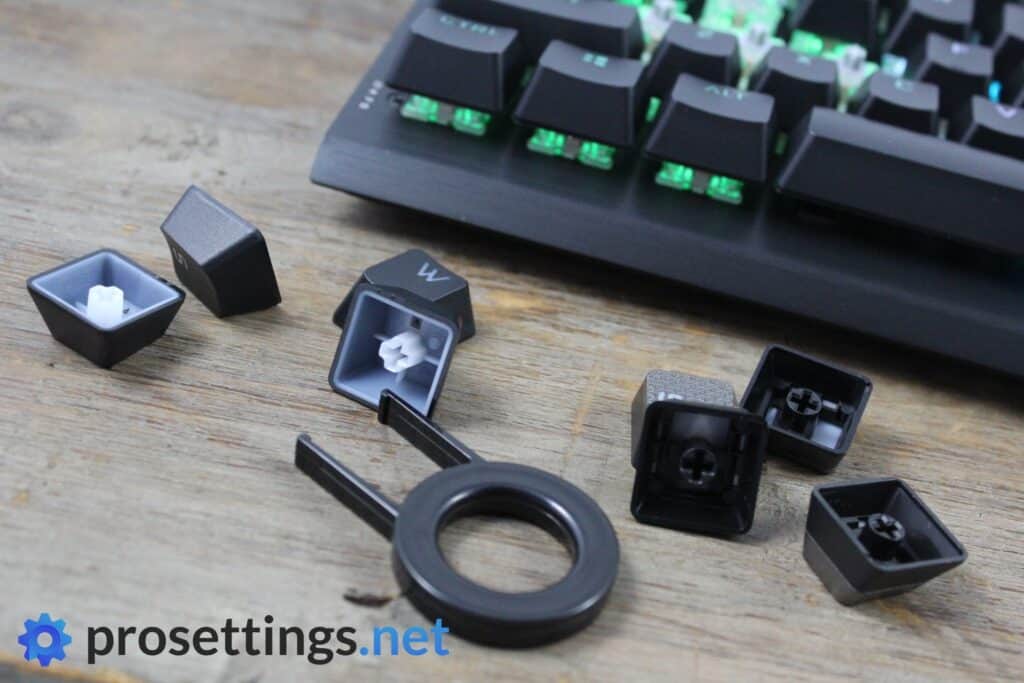 The included keycaps are made out of PBT, which feels a lot better to type on than (cheap) ABS caps if you ask me, and it also drastically reduces the amount of shine the keys will develop after use. This switch from cheap(er) ABS keycaps to PBT keycaps is something that’s happening all across the mass produced keyboards industry, and it’s a change that I really like. The font on the caps is perhaps a bit too ‘gamery’ for me, but that’s a subjective opinion.