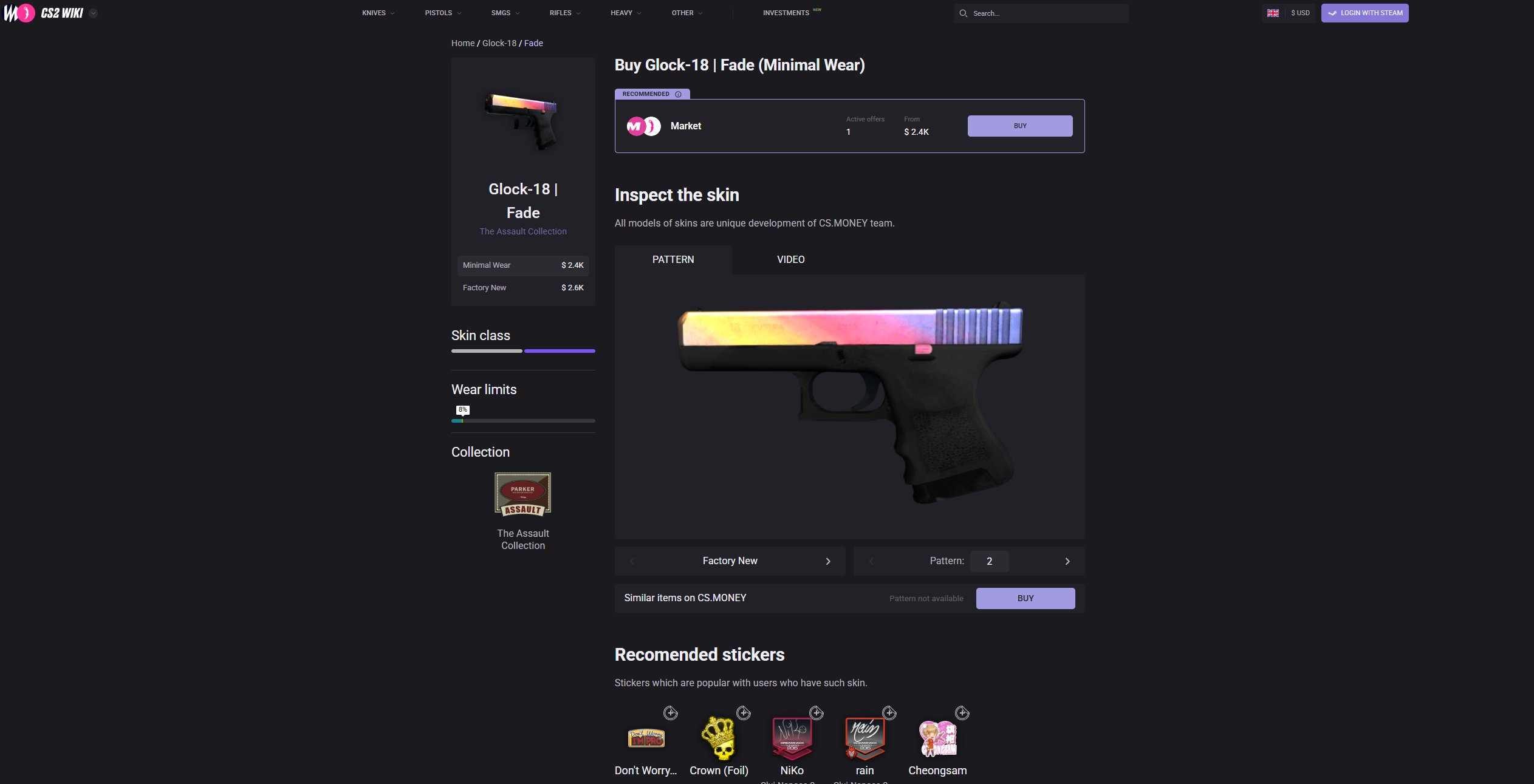 CS.Money has its own skins Wiki. There, you can find a lot of useful information such as the current price, wear range, historic price chart, and much more. Notably, you can scroll through all available patterns for a certain skin and instantly see what said pattern looks like. The Wiki even shows recommendations for which stickers you can put on the skin.