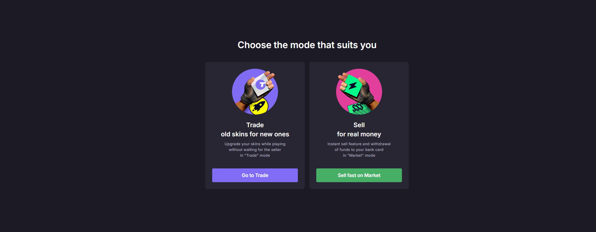 CS.Money offers two ways to trade skins. You can use their built-in trading system (which uses their own bots and works instantly) or you can buy and sell items using the peer-to-peer marketplace.