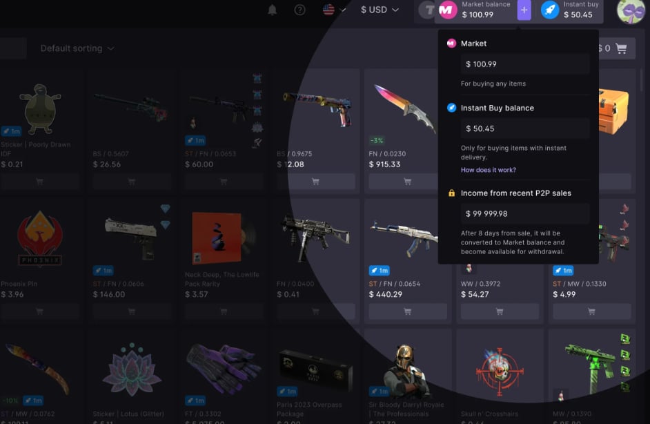One confusing aspect is that CS.Money uses three different types of balance, namely Market Balance, Instant Buy Balance, and P2P sale funds. The difference between these balances is explained pretty clearly in their FAQ, but it absolutely pays off to be aware of these different types. In short, though: after pending holds or clearances, these balances are mostly added to your Market Balance, so it’s not as if certain funds are ‘locked’ within certain sections of the site.