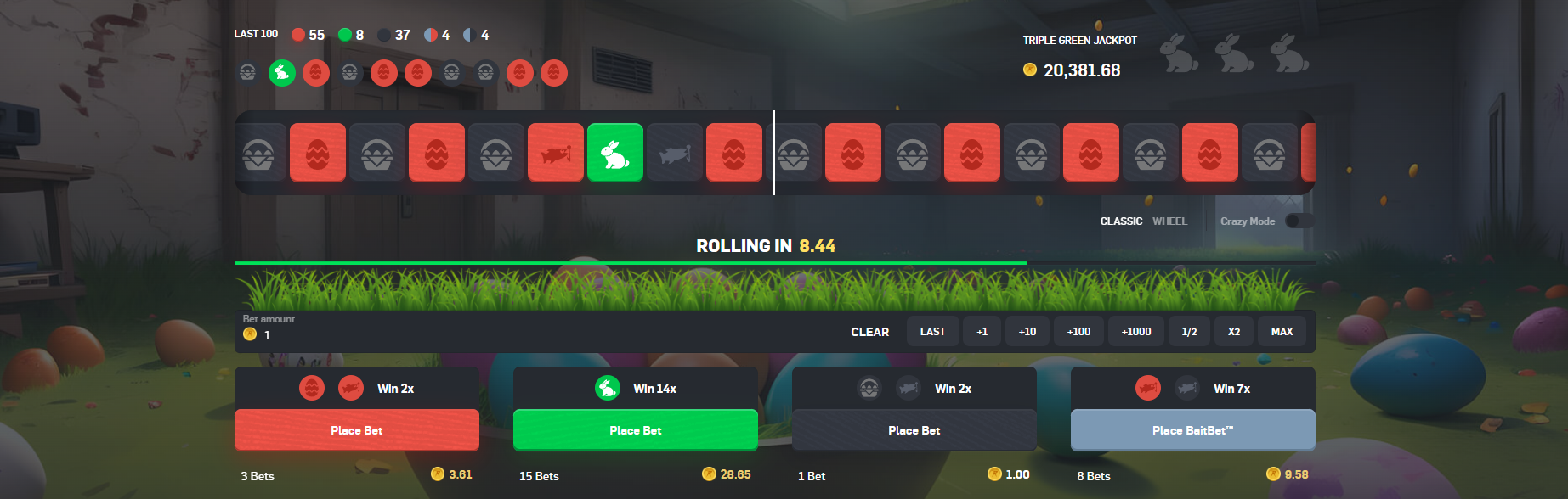 You can also place a bet on green (which pays out 14x) or place a BaitBet. Some of the icons on the black and red squares have their usual icon replaced by a fish; if you place a BaitBet and the wheel lands on a fish, you get a 7x payout.