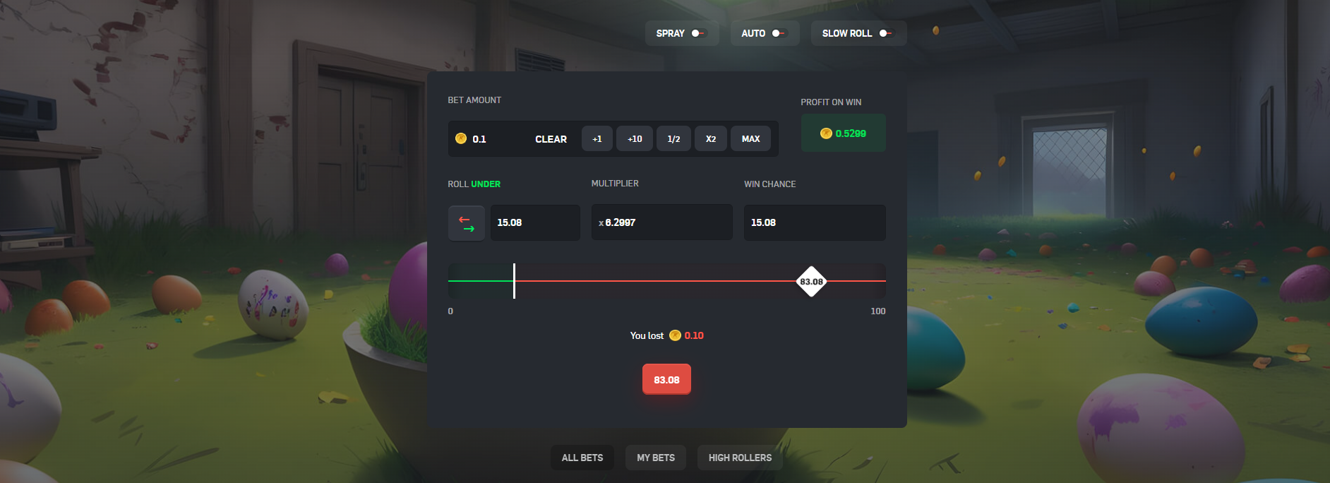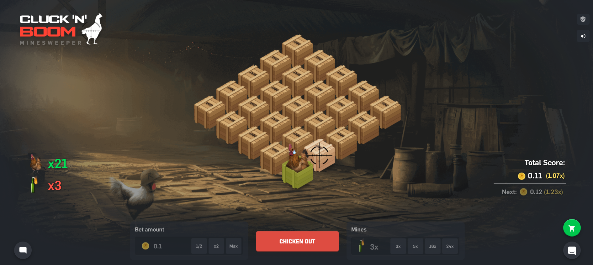 The more mines you decide to add to the playing field, the higher the worth of each unboxed chicken. A higher amount of mines obviously also means that there’s a higher chance to accidentally unbox a mine, so a careful balancing of risk/reward is in order.