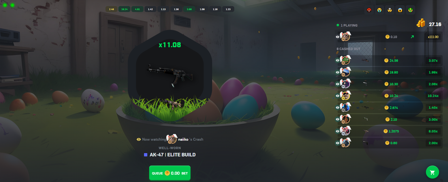 In crash, players place a bet during a betting/standby phase. Once the betting phase is over, the game starts and a multiplier will start counting up. This multiplier begins at x1.01 and counts up continuously. Players can choose when they want to cash out. If you cash out when the counter is at x11.08, you get your bet 11.08x.