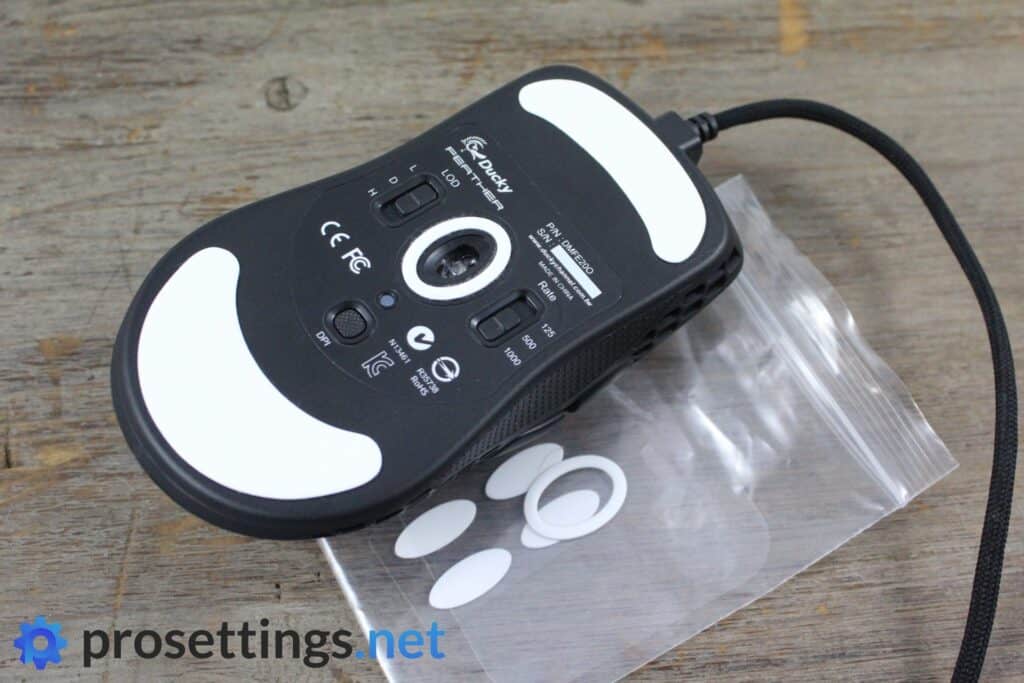 Speaking of first impressions and performance: I was pleasantly surprised by the two pairs of mouse feet Ducky has included. I’m not talking about a pair of replacement feet here, but rather a whole set of larger skates that you can use should you want to use these larger ones over the standard four smaller ones. Since the glide can massively impact how a mouse feels this is a nice inclusion by Ducky, and the fact that the bottom has cutouts for both feet makes it more than an afterthought.