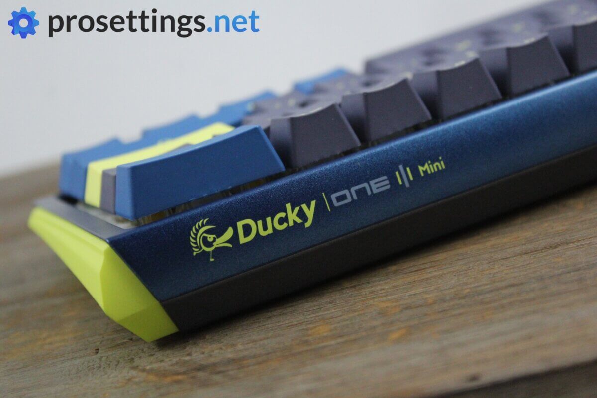 What’s immediately obvious with the One 3 Mini is the fact that Ducky have done away with the standard black design that I saw on the One 2 Mini that I reviewed. The colorway that I received is called ‘DayBreak’ and it’s, as you can see, a mix between blue, grey and a sort of yellow-green neon mixture. Despite the fact that I prefer a minimal aesthetic for my work desk (my gaming space often looks like the Las Vegas strip by comparison) I find keyboards that are completely black to be a bit boring, and I find this to be just the right amount of striking without going overboard and looking gaudy, but of course that’s very subjective. I rather like the look of this board, but that’s also because it uses colors that I like.