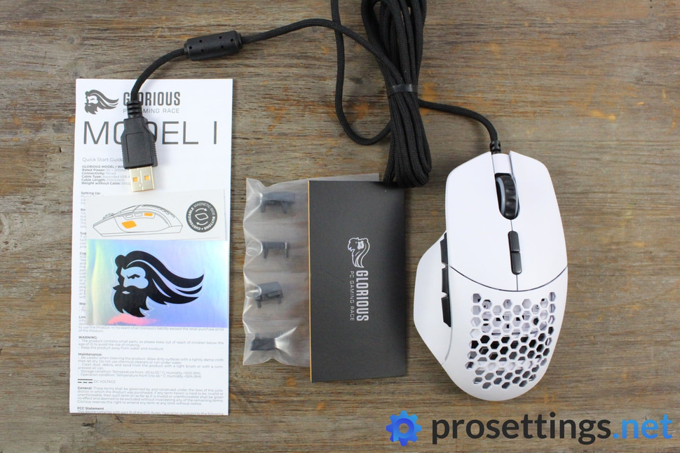 Inside the box you’ll find a Glorious sticker (curiously, the branding on the Model I is still the old Glorious branding), the additional mouse buttons that allow you to customize the mouse to your liking (to a certain extent) and then of course the usual documentation. I always like to see additional replacement mouse feet included with gaming mice, but since this mouse probably isn’t aimed at hardcore competitive gamers I can kind of see why they didn’t include those.