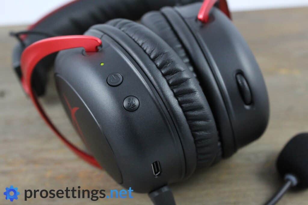 The Cloud II Wireless can be used as a plug and play device so you don’t really need to download any software if you don’t want to. On the right ear cup there’s a volume wheel and on the left cup you’ll find a charge indicator LED and a mic mute button (muting the mic activates a red LED ring at the mic, which is nice) as well as a power button. You can press that power button to toggle the 7.1 Surround Sound mode, and the mic mute button can be long pressed to toggle sidetone.