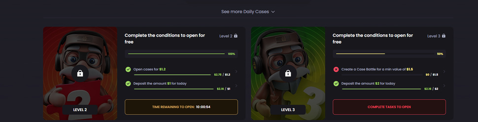 Key-Drop kind of has a player level system that gives you access to free cases, but it works very differently from the permanent levels that you see on some other websites. On Key-Drop, you need to complete a specific set of tasks in order to go up a level. Important to note is that these tasks reset every day; you don’t have a permanent player level on Key-Drop.