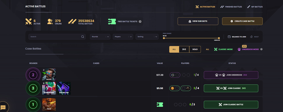 Players can create their own battles and -if desired- play against bots instead of humans. There’s also ‘Underdog Mode,’ where the player with the lowest total unboxing value wins everything.