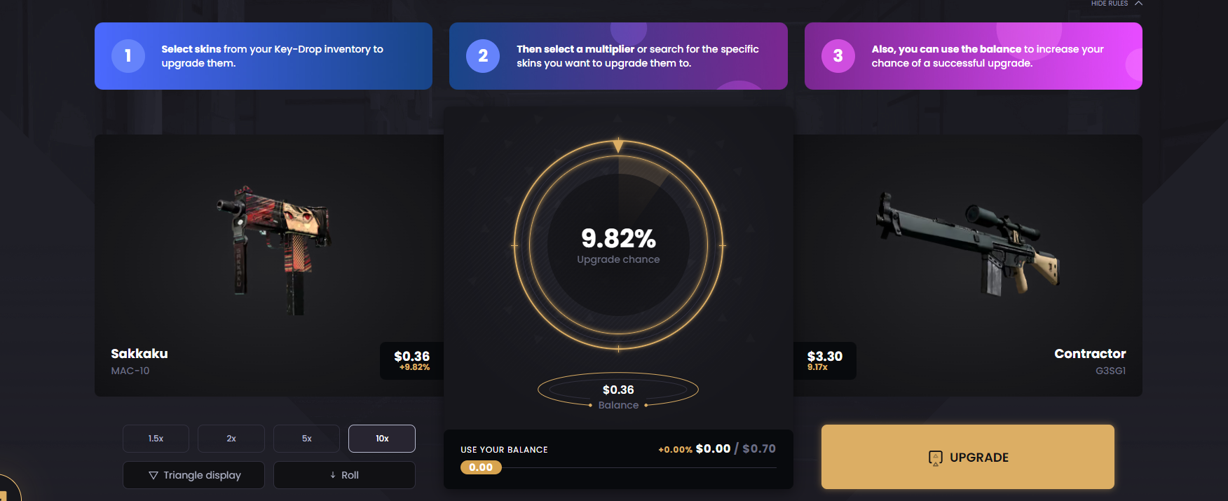 The closer the value of the item you’re trying to upgrade to is to the value of the item(s) you’ve submitted for upgrading, the higher your odds of making it. If you want to upgrade a $2 skin to a $500 skin, your chances of making it are extremely small.