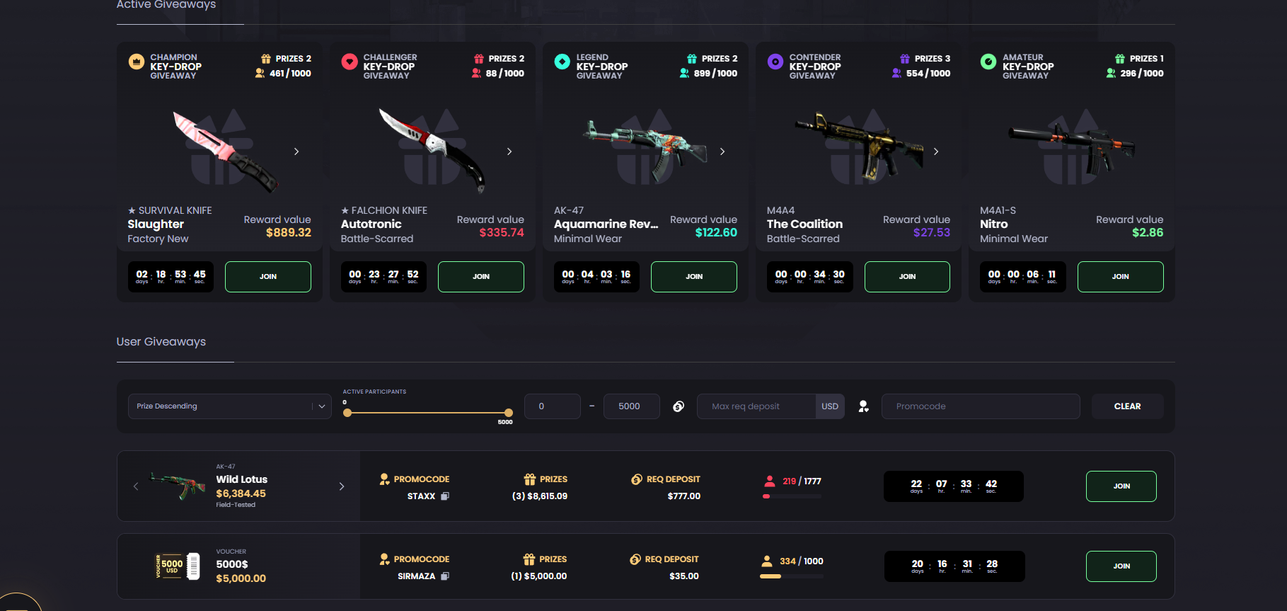 These giveaways range all the way from a $0.01 voucher with ‘deposit $0.4’ requirements to skins worth over $5,000 with a minimum deposit of $777 as a requirement for joining.