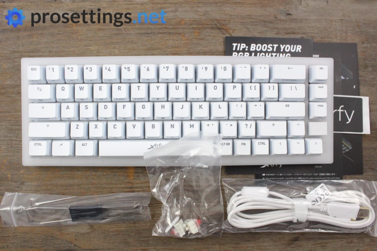 Inside the box you’ll find a switch- and keycap puller, two replacement switches, the USB-C cable, a replacement plate to place next to the arrow keys, the usual documentation, and a sticker. That is pretty much all that you would want to see included when you’re buying a gaming keyboard, so I have absolutely no complaints here.