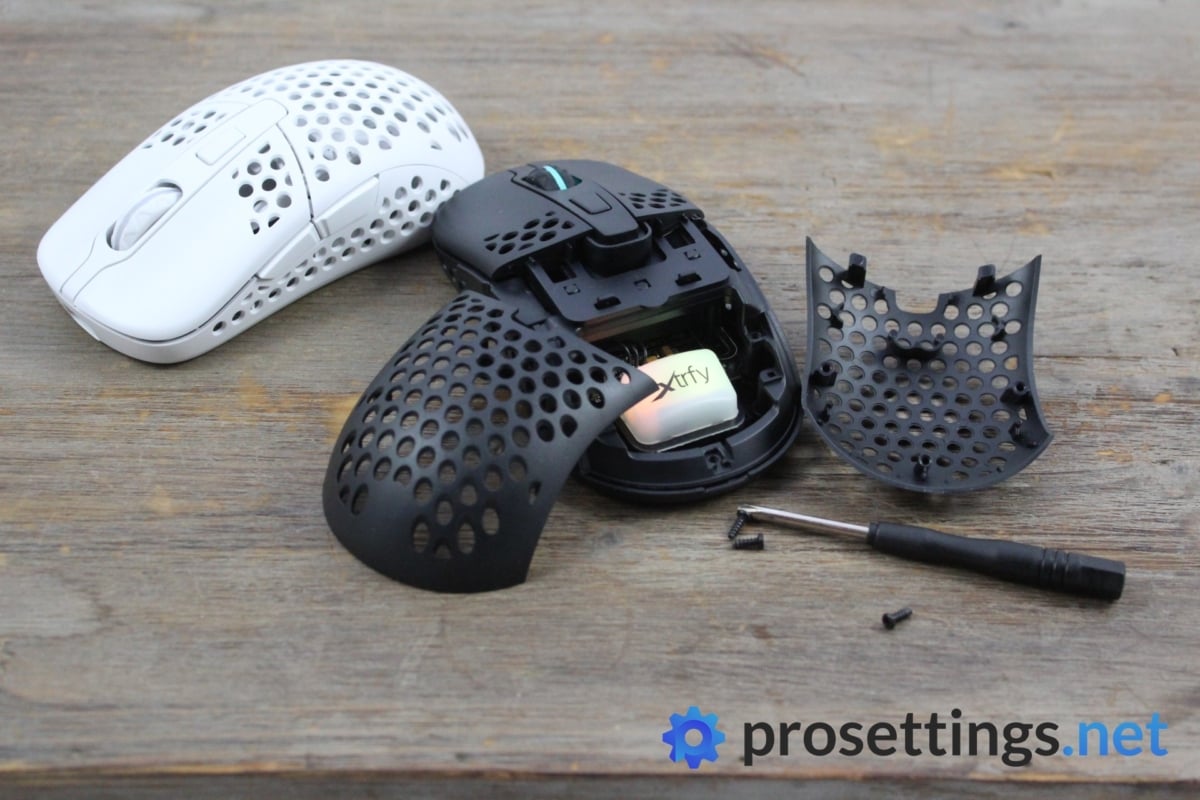 Xtrfy don’t skimp on the things that they include in the packaging. Inside the box you’ll get the mouse, an additional back shell (more on that in the next section), a screwdriver to swap said shells and change the battery balance, a set of replacement mouse feet, the usual information, a sticker, a charging cable, and extension dongle for the (included) wireless reicever, and two special keycaps.